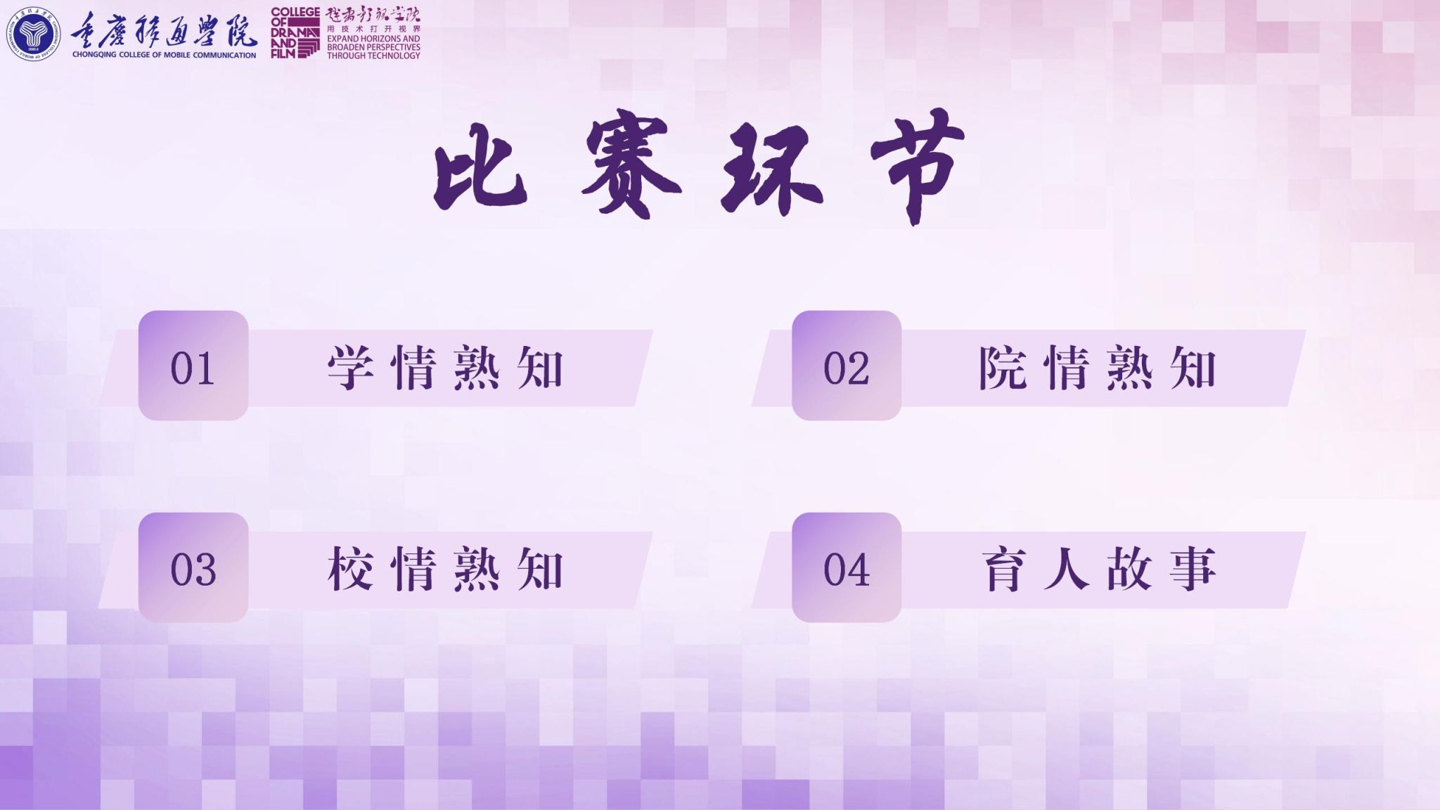 本次比赛由学情熟知、院情熟知、校情熟知、育人故事四个环节组成,从学生精准画像、学院建设发展、学校基本情况和育人成长故事循序渐进地考察每位辅导员对学生的熟悉程度,检验辅导员日常工作成效。