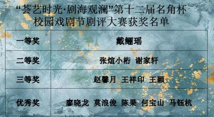 百舸争流,奋楫者先。本次“荟艺时光·剧海观澜”第十二届名角杯校园戏剧节剧评大赛获奖名单如下: