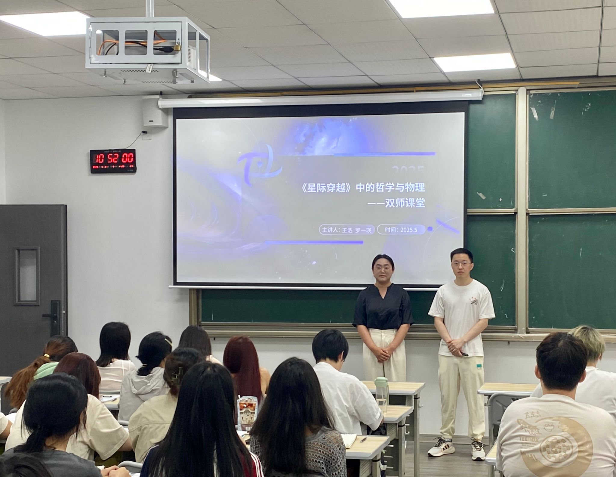 5月21日,通识教学部人文教研室的王浩老师和科学教研室的罗一瑛老师,以《星际穿越》中的哲学与物理为主题,在4202为2023级广播电视编导4-6班的同学共同开展了一堂双师授课。