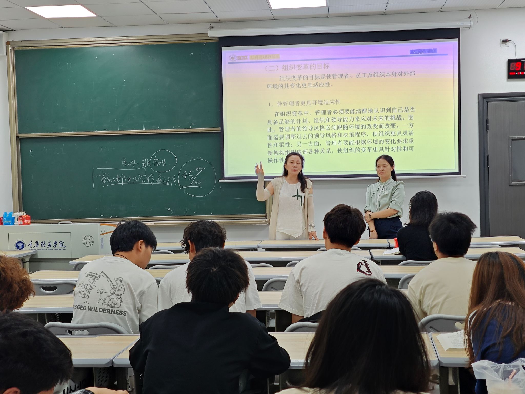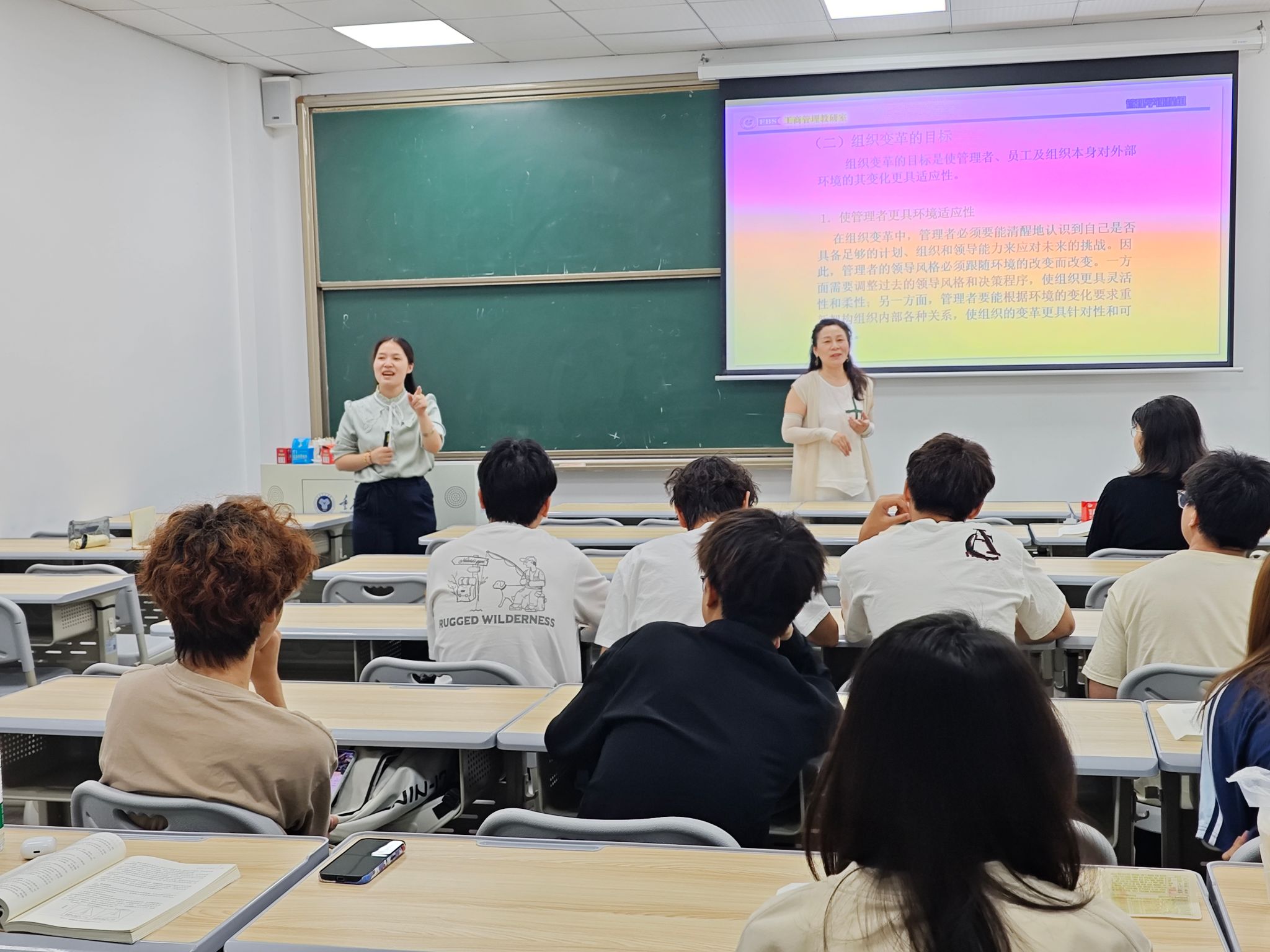 5月28日,工商管理教研室的漆颖老师与新商科教学部杨华琼老师携手于4110教室为2024级财务管理2班的同学开展 一场探讨式的“双师”融合授课活动。本次课程旨在通过理论与实践的结合,深入探讨组织变革的必要性、基本内涵、目标及其影响因素,为学生们提供前沿的学术视角和丰富的实践案例。