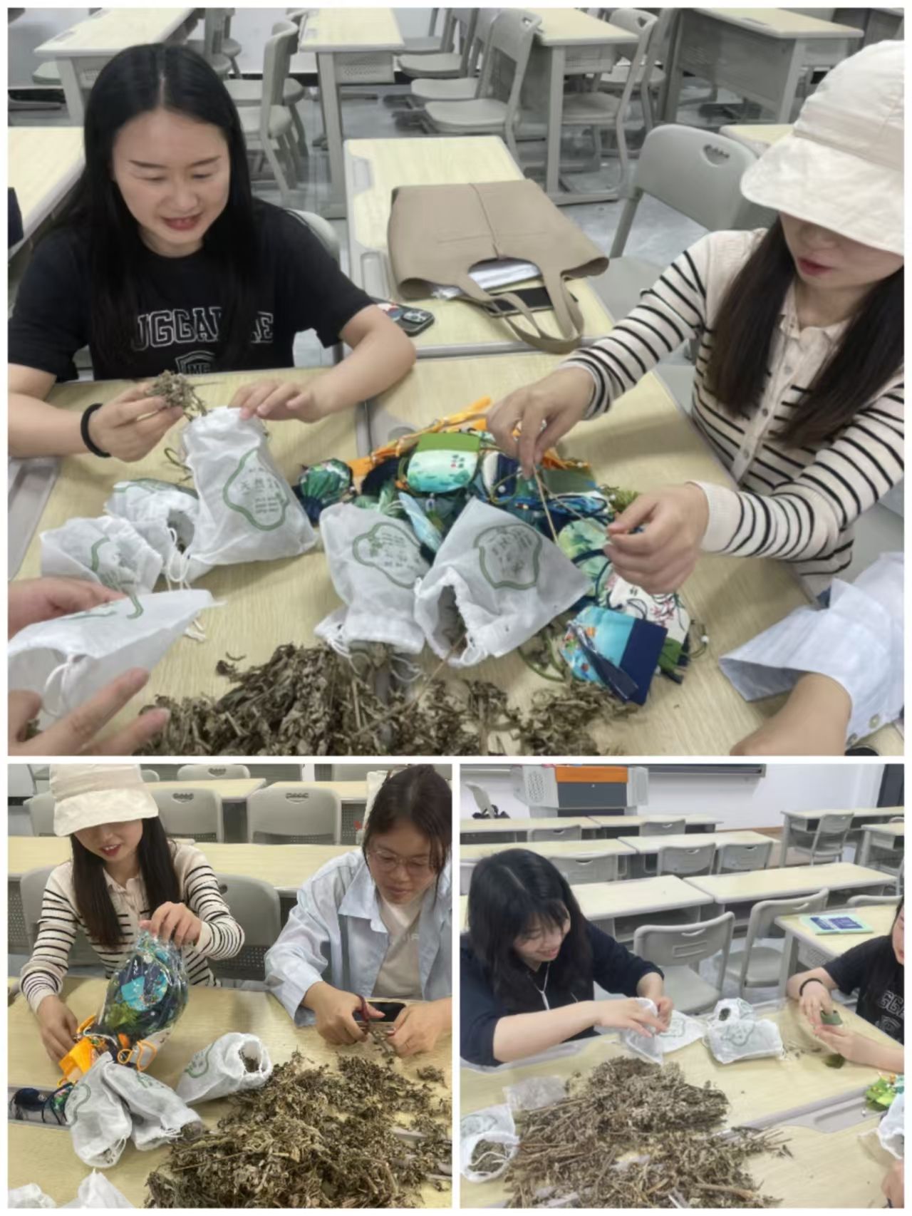 活动现场,各种图案的香囊好看的摆放在一起,晒干的艾草弥漫着淡淡的艾草清香。老师们按照视频指导,从剪艾草、填充艾草、封口装饰等工序,完成了一个个美美的香囊。