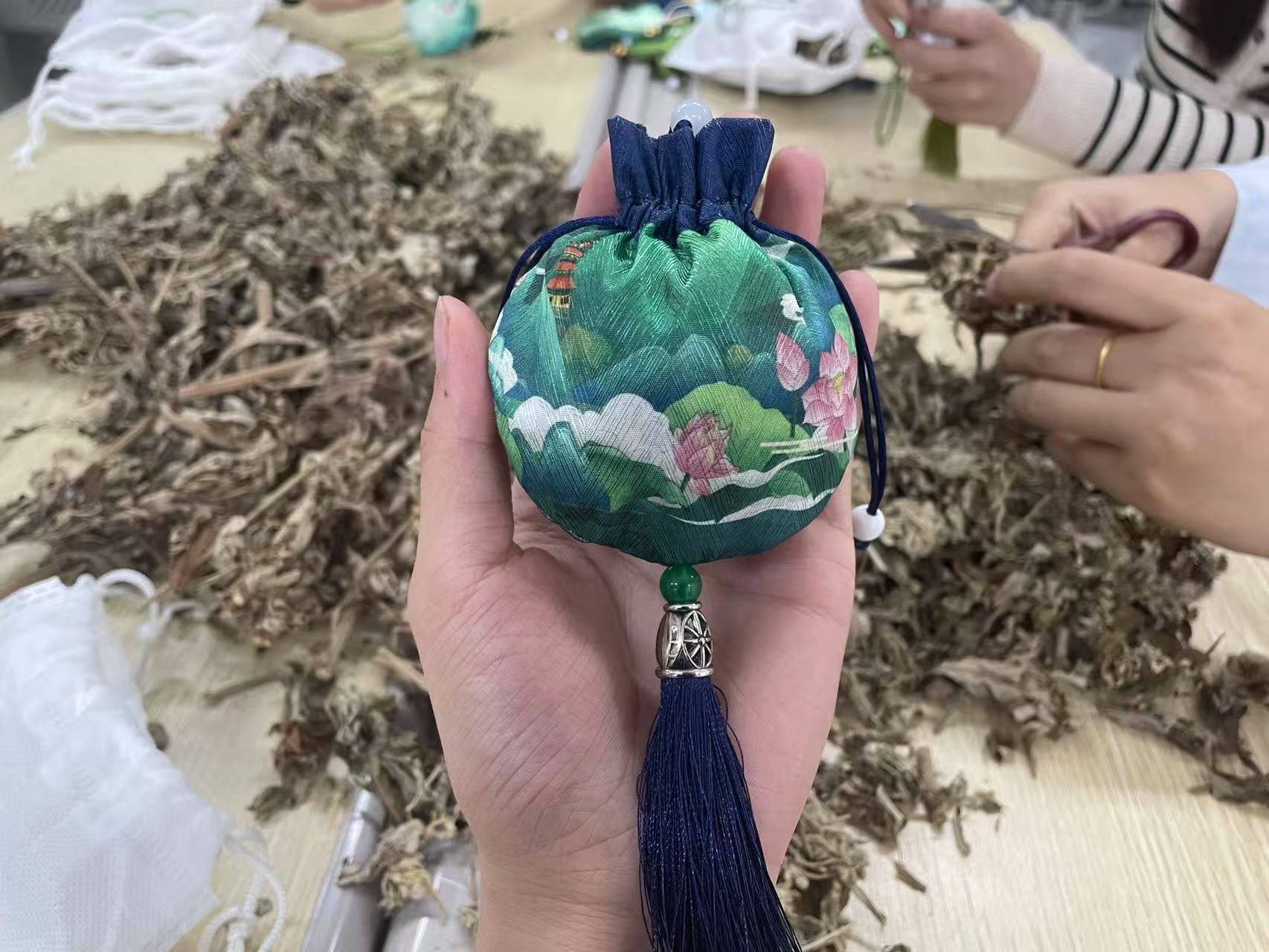 香囊虽小,却蕴含深意:艾草象征健康,艾草性温味苦,古人将其填充香囊随身佩戴,或悬挂于门楣,以驱虫避疫。历史上,边关将士以艾草香囊寄思乡之情,如今,这一传统成为企业文化中“以家为根,以国为魂”的生动注脚。