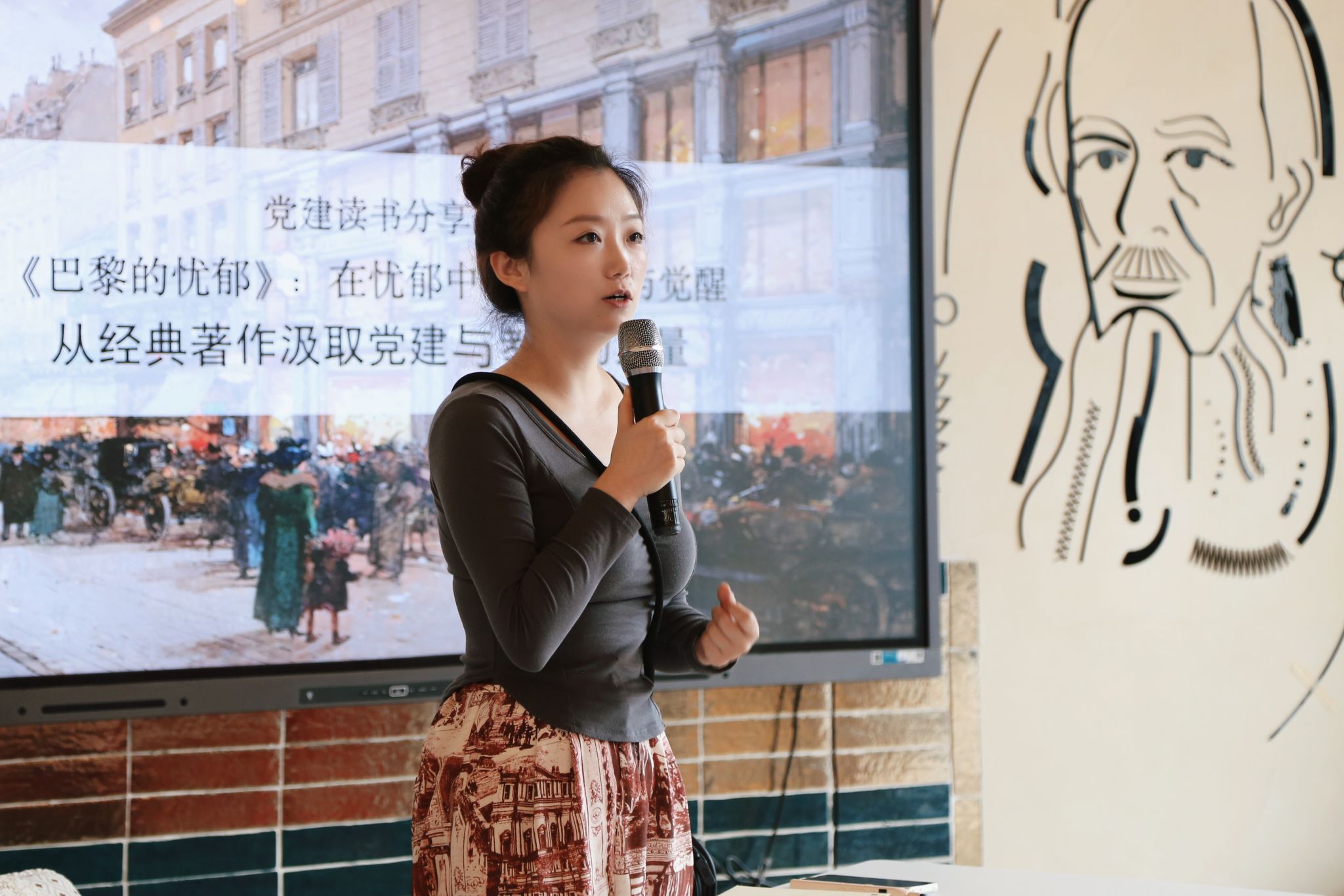 第三位分享人李毓美老师为大家带来了一本可以装在口袋里随时看的散文诗集,法国诗人夏尔·波德莱尔创作的《巴黎的忧郁》。她告诉大家推荐这本书的理由是这本书文学价值高,能引发自己对当下复杂社会环境中保持清醒,如何在困境中坚守理想的思考,并与党的理论中“自我净化、自我革新”的精神相契合。《巴黎的忧郁》虽然描绘了社会的阴暗面,但它的核心并非绝望,而是对自由的永恒追求。正如波德莱尔所言:“唯独能证实和别人平等的人才能和别人平等,唯独善于争得自由的人才配享有自由。”希望这本书能激发大家的思考,也让我们在党建与教育工作中,始终保持清醒的头脑与坚定的信念。