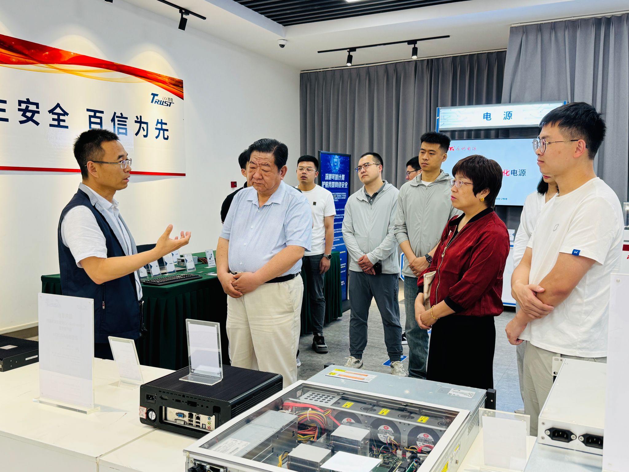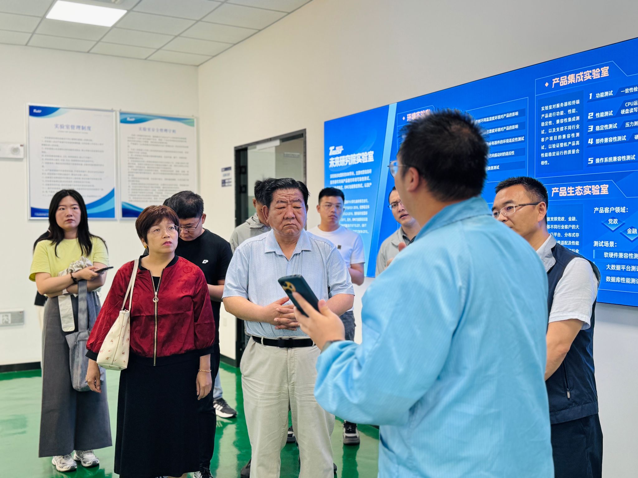 在魏建英副总裁的引领下,两校领导及教师团队深入百信现代化生产线与前沿研发实验室进行实地参观。整洁高效的智能车间、严谨专注的研发场景,让高校代表们近距离感受到了国产信创产品从设计到落地的硬核实力与创新活力。