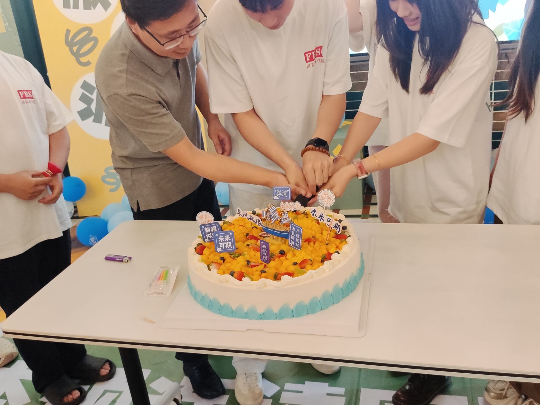 而这份感动尚未平息,专业导师—彭晓阳老师便用歌声为毕业生们送上独特的祝福,抒情的旋律,让大家沉浸在音乐的魅力之中。随后,工作人员缓缓推出精美的毕业蛋糕,蛋糕上 “毕业不散场” 的字样格外醒目。大家围在一起,分享着甜蜜的蛋糕,也分享着此刻的喜悦,共同铭记这难忘的时刻。