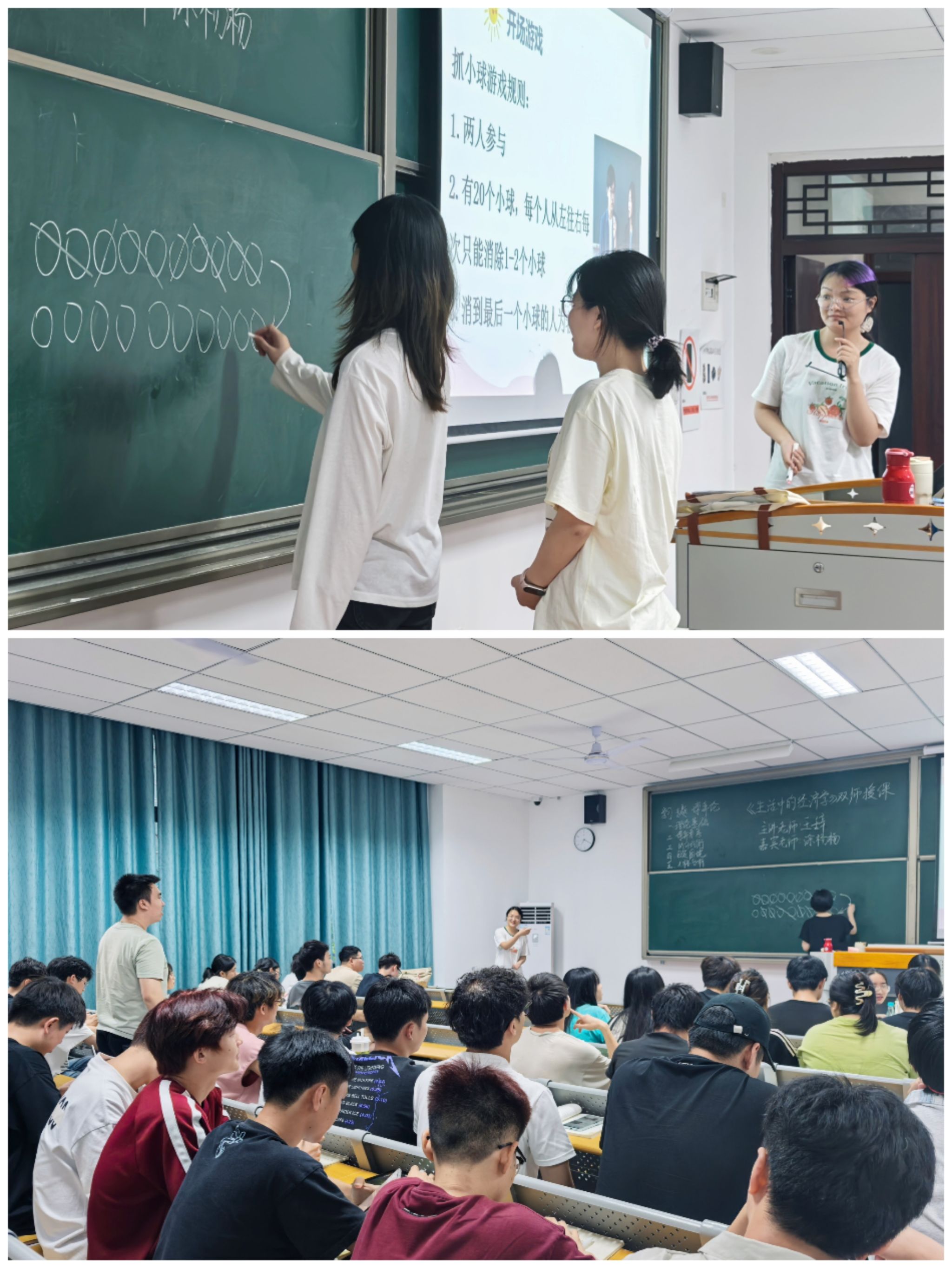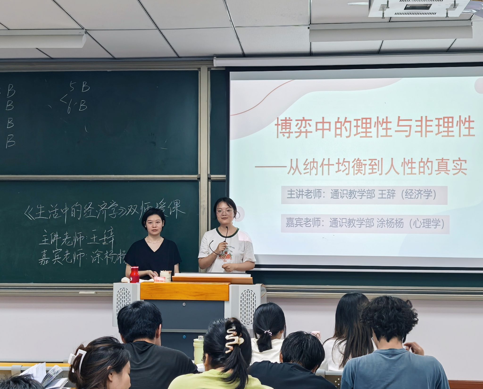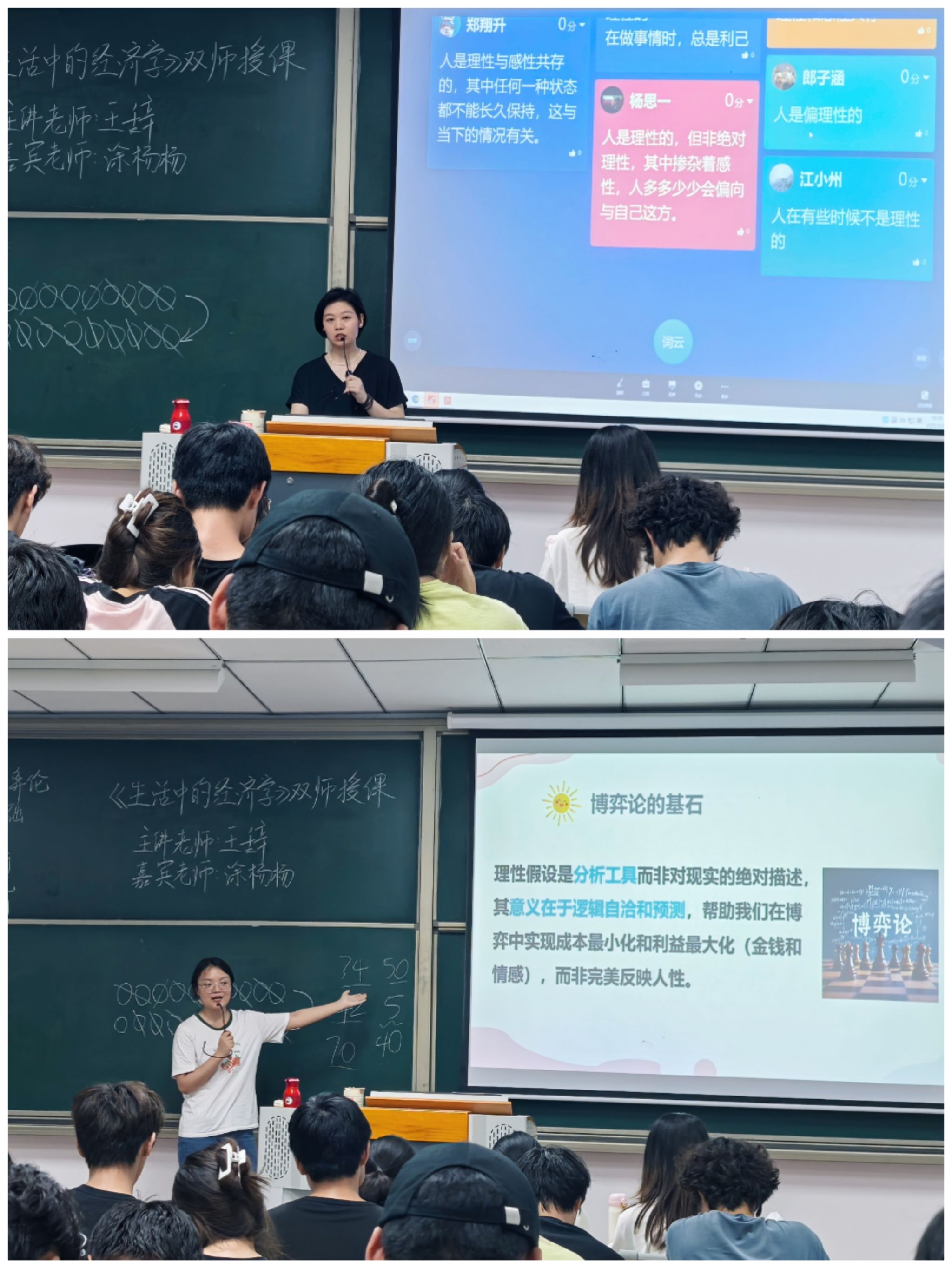 为帮助学生更好地理解和应用博弈论相关知识,5月20日晚上7点,《生活中的经济学》主讲教师王辞邀请《人格心理学》主讲教师涂杨杨,在勤者楼405教室开展了一场主题为“博弈的理性与非理性——从纳什均衡到人性的真实”的双师授课。课程通过互动游戏、案例分析和小组讨论等形式,将经济学的理性分析与心理学的行为洞察相结合,带领学生找寻博弈中的最优策略。