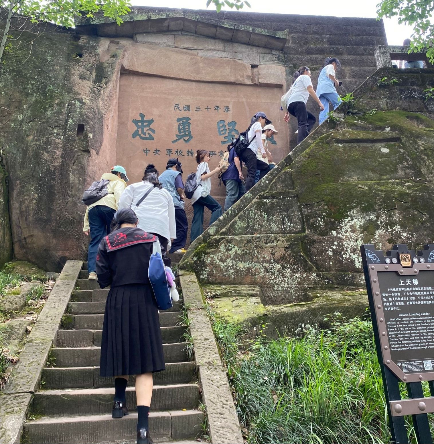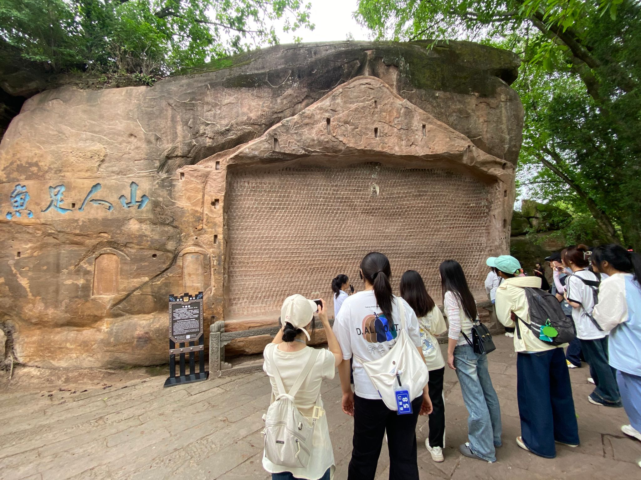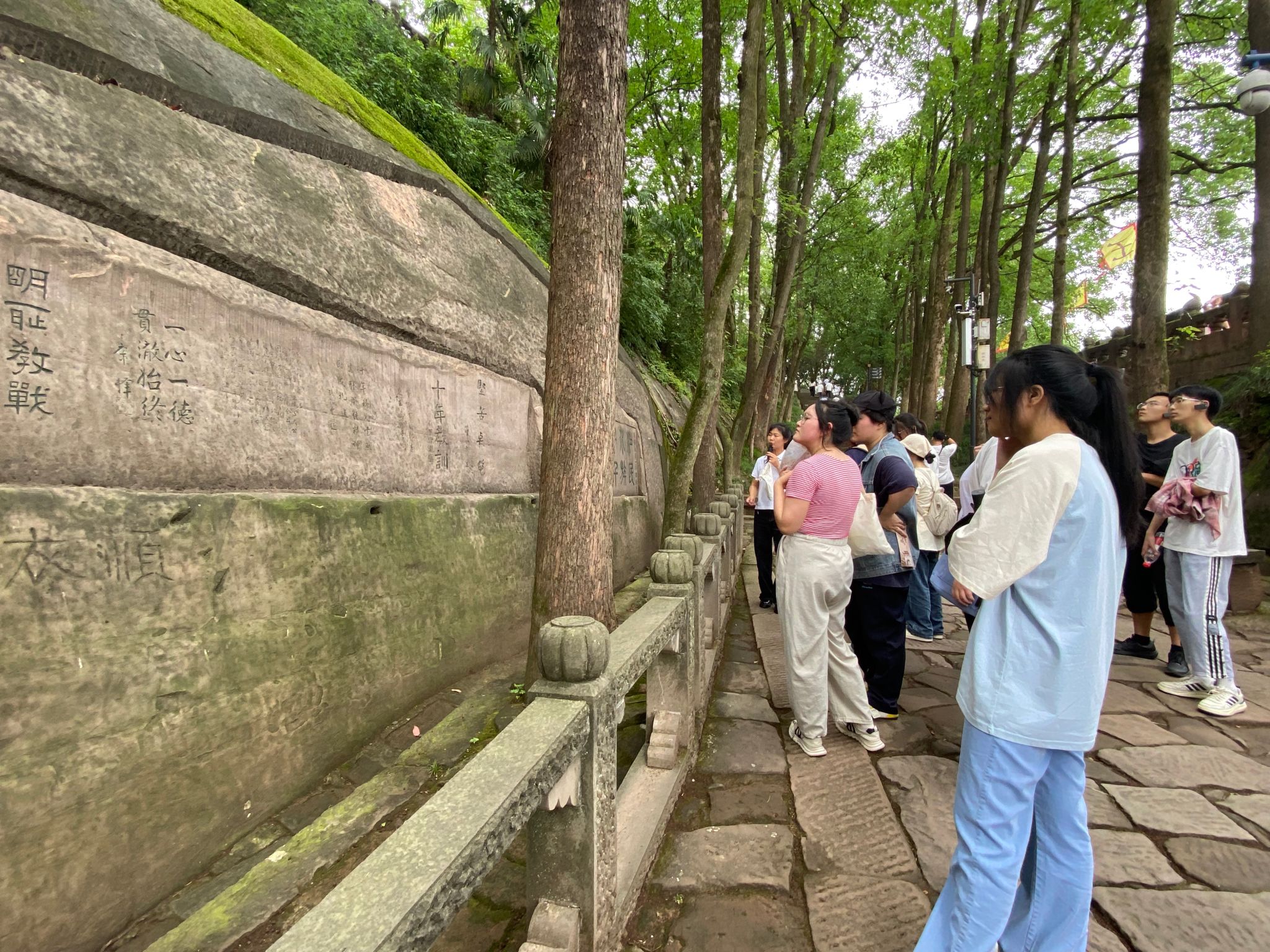 作为“佛教思想中国化”的立体实证,钓鱼城遗址为师生们提供了沉浸式的哲学课堂。从唐代悬空卧佛宁静展现“般若空性”的原初形态,到宋代千佛崖宏大石刻折射佛教吸收儒家伦理后的世俗化转向,再到清代三圣岩铭刻禅宗“平常心是道”的现世关怀——同学们沿着时间轴线,在两位老师的讲解中直观触摸到佛教思想的逐步演变。王浩老师于千佛崖前剖析“佛像亲和形态与秩序布局中融入的儒家伦常理念”,李汶陕老师在三圣岩解读“禅宗将终极智慧落于日用伦常”的哲学深意。这堂行走的课程,使同学们清晰见证了佛教如何在中国社会土壤中完成思想内核的重构与表达形式的转化,深刻理解了从“空性原初”到“儒释融合”再到“现世落地”的完整中国化轨迹,将课本中的抽象概念具象为可感知的现实脉动。