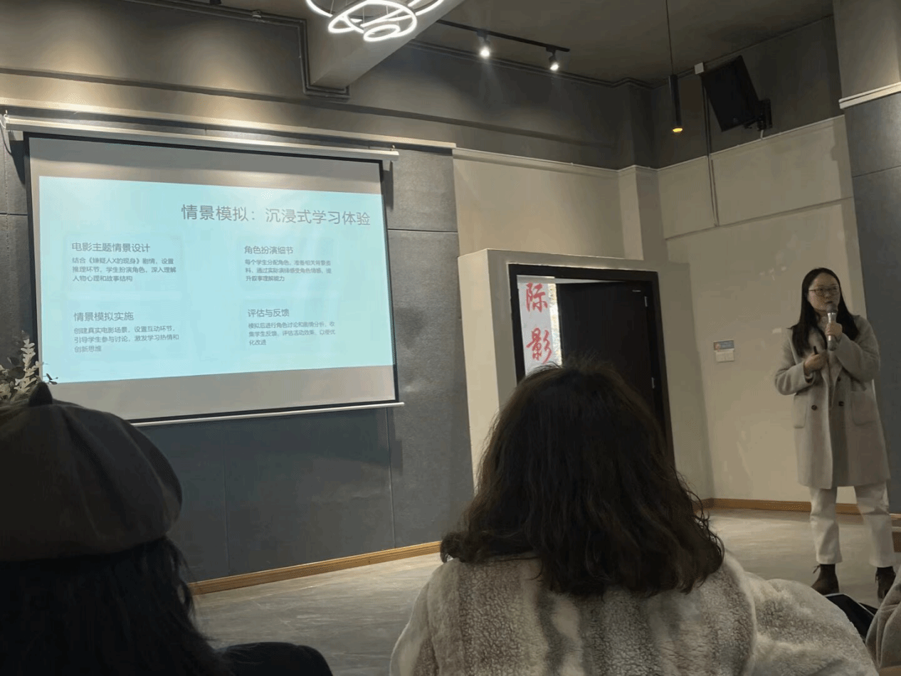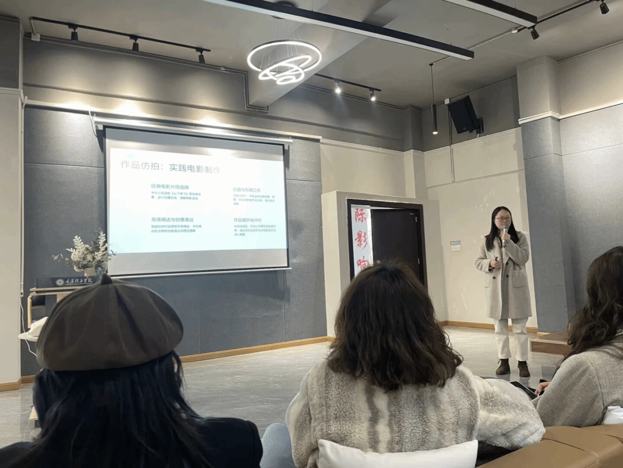本学期,合川校区电影评论中心共有两批次三位教师为磨课对象,第一批次为《从小说到电影》校级核心课程负责人力冬梅老师。3月12日,力冬梅老师开展电影通识课程教学方法分享会,聚焦“审美、文化与批判思考”目标,带来多种创新教学方式的实用分享。在本次分享中,她主要提到了以下几种教学方法创新:1.实践电影制作:介绍如何通过设置作品仿拍课程作业,让学生分组拍摄经典场景并进行导演阐述,加强学生的课堂参与感与实践能力;2.情景模拟:如《嫌疑人X的献身》推理环节,让学生角色扮演,打造沉浸式课堂;3.思政与文化教育结合:采用案例分析与对比教学相结合的教学模式,以《了不起的盖茨比》为例,对比小说与电影差异,结合多媒体教学,利用视频片段和在线资源拓展视野,同时融入思政与文化教育,该方法提升了学生学习兴趣与文化理解能力,也为电影通识教育提供了新思路。