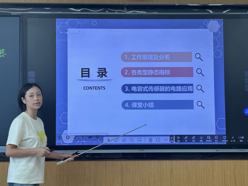 接着,邓娟老师以《传感器原理及应用》课程中的“电容式传感器”为主题,邓老师以生活中防窥膜效应和手机触控屏为切入点,瞬间点燃学生兴趣。授课时条理清晰、逻辑缜密,深入剖析变间隙、变面积、变介电常数三类电容式传感器原理与特性,配合视频演示加深理解。结合液位检测、指纹识别等案例展现技术价值,潜移默化的将“注重实验验证、追求精益求精”的科学家精神融入知识的传授中。其借助多媒体化抽象为形象,设计阶梯习题巩固知识。费莉老师指出可以将视频插入PPT中。刘洪老师则提出在讲课过程中调整一下板书结构,使学生们对于知识点的脉络结构更加清晰.