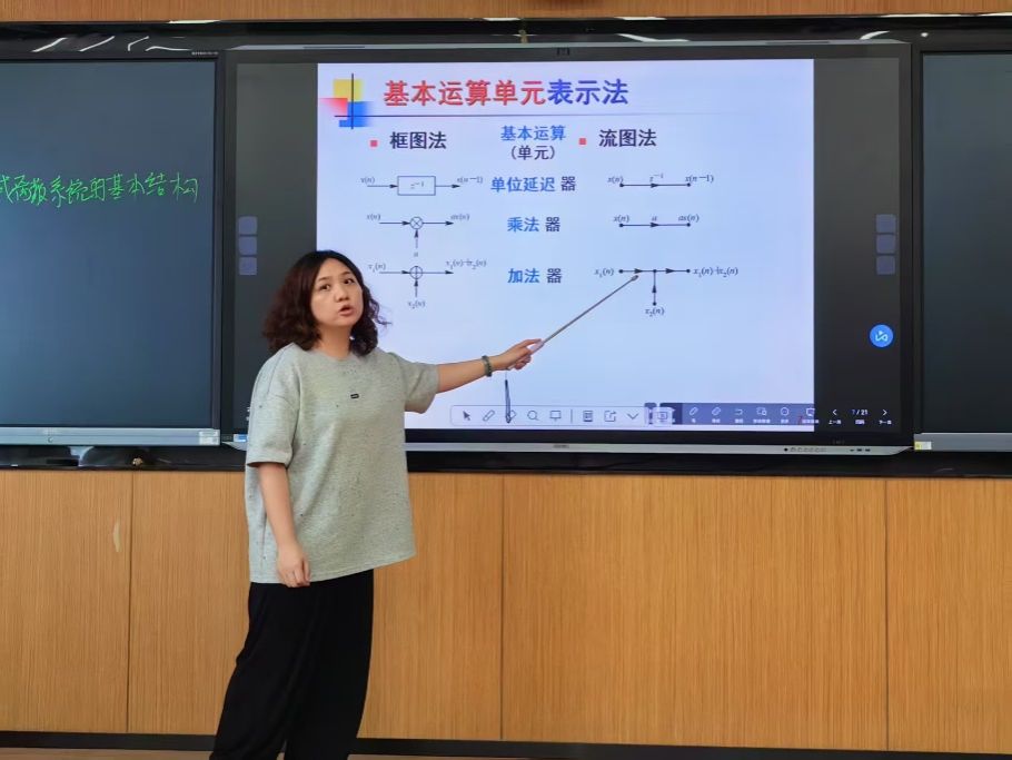 随后,何春燕老师以《数字信号处理》中的“时域离散系统的网络结构”为主题,教学伊始及结束巧妙使用学习通对学生所学知识进行回顾与巩固,教学中聚焦直接型、级联型与并联型三大核心实现结构,深入剖析其数学本质与工程特性。创新运用MATLAB动态仿真对比不同结构对阶跃信号的响应,直观暴露有限字长效应对系统精度的颠覆性影响。随后王玮老师提出,PPT可以增加更多动态演示元素。比如,在介绍网络结构的信号处理过程时,制作动态的信号流动动画,让学生直观看到信号在不同元件间的传递和变化。