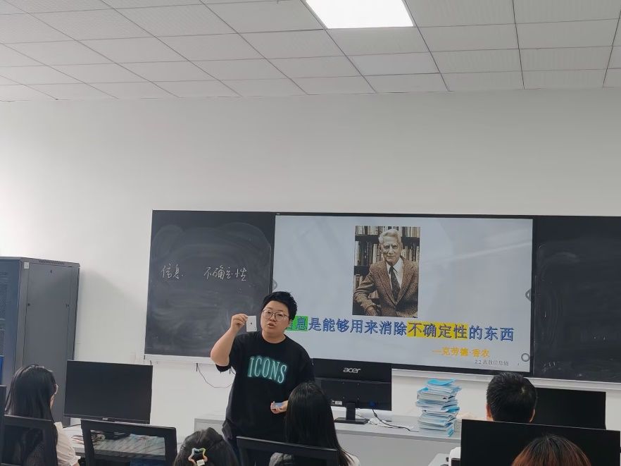 在《信息论与编码》的课堂上,程彩玲老师以“信源熵”为主题,别出心裁地用扑克牌开启知识大门,瞬间让课堂氛围活跃起来。课程伊始,程老师手持一副扑克牌,抛出问题:“同学们,从这副牌里随机抽一张,不同牌被抽到的概率不同,这背后藏着怎样的信息奥秘呢?”大家的注意力一下子被吸引过来。接着,程老师结合扑克牌讲解概率与信源熵的关系,将抽象的信源熵知识变得生动易懂,激发了学生们对《信息论与编码》的学习兴趣。讲解结束后许癸驹老师建议,完善教学评估体系,在课程结束后设置针对信源熵知识点的专项测试,全面了解学生对知识的掌握程度。