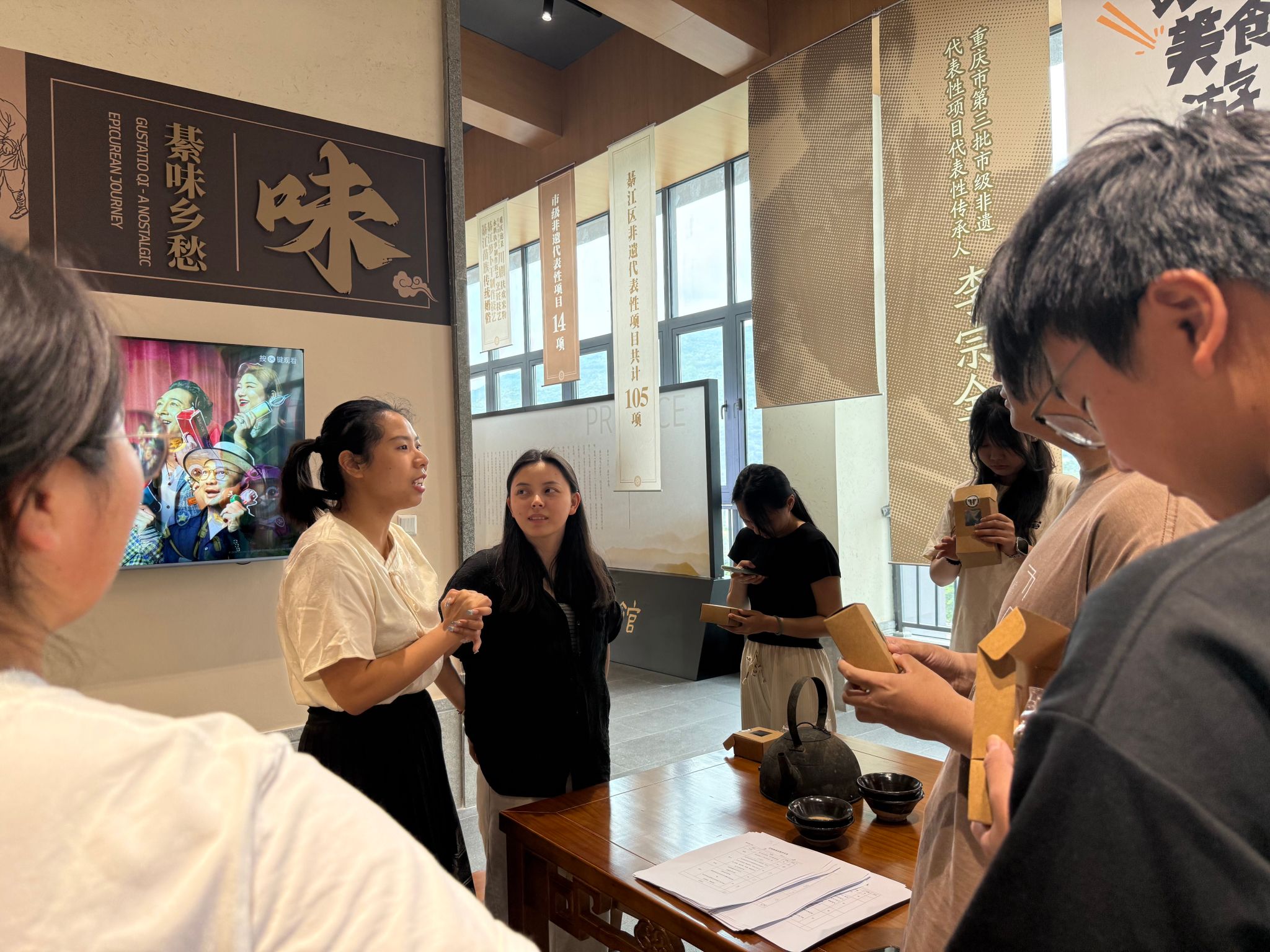 5月28日下午,由通识教学部联合横山书院綦阅工坊举办的“读一本书,识一座城”主题实践活动在綦江非物质文化遗产馆“綦味乡愁”展厅迎来精彩收官。本次活动由通识教学部王梓凡、罗茂格、冉巍三位教师联合开展,作为《巴渝历史与文化》课程的实践延伸,延续了“文化解码+技艺实践”的特色教学模式。在前两期文化讲解和制作实践的基础上,本期活动以“成果展示与盲品评比”为核心环节,通过沉浸式体验深化教学效果。