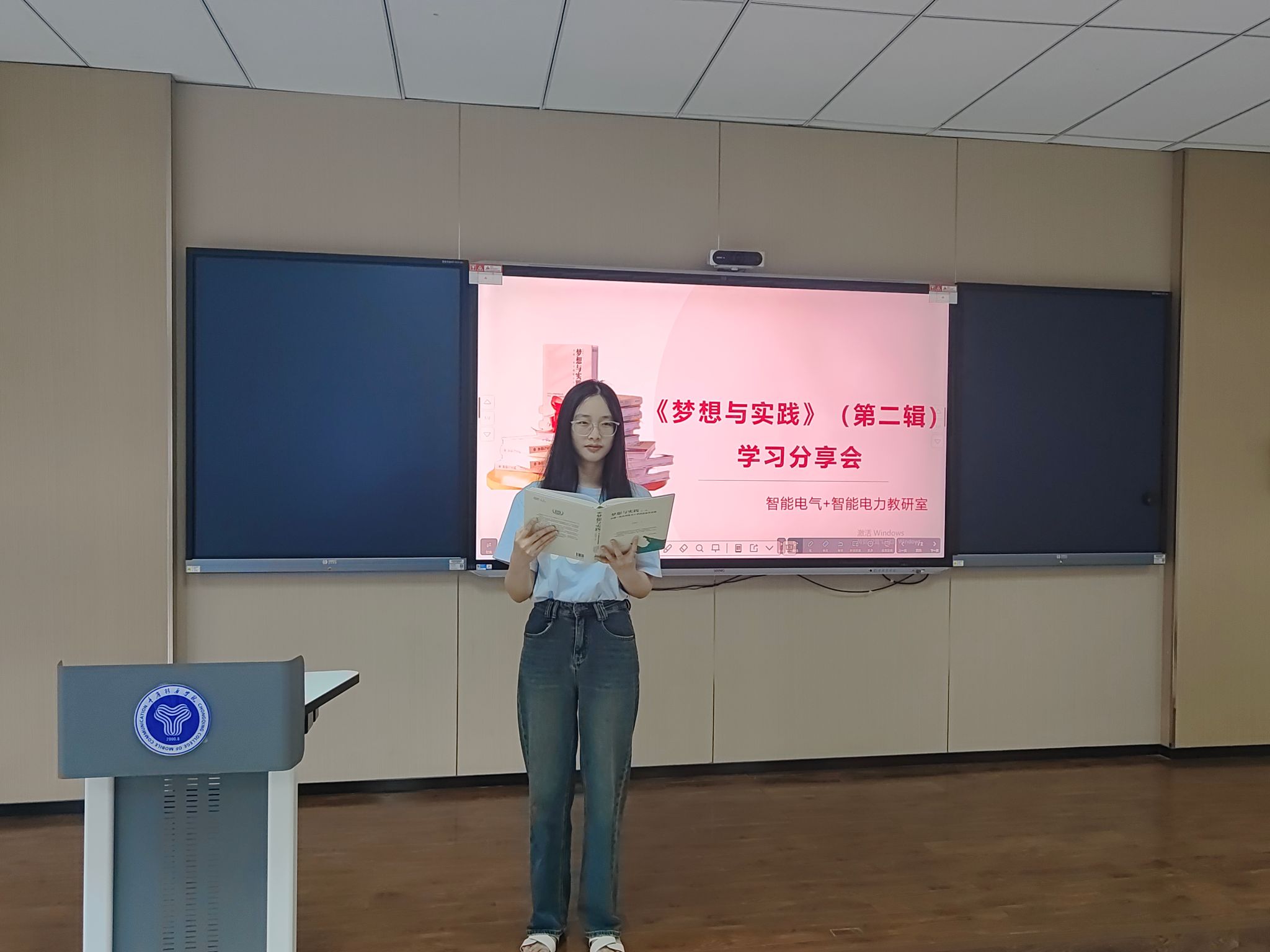 智能电气教研室主任晁晓洁老师首先介绍了深入学习《梦想与实践》(第二辑)这本书的重要性,指出该书对教师教育实践与职业发展具有深刻指导意义。随后,结合自身教学感悟,分享了《教育理念:卷到极致不如不同》一文,围绕“现实情况”“不同赛道”“培养模式”等内容展开,倡导教学要与“学生成长需要”相匹配,因材施教,让每一个学生个性被尊重。随后,王柳月、谭静文、王勇三位老师依次上台,结合自身的阅读体会与教学实践,进行了精彩分享。王柳月老师以书中《要有我们自己的个性》为切入点,结合自身教学实践举例分享:在教学过程中,应注重鼓励学生展现个性。她特别强调,即便部分学生在专业学习上表现并不突出,但每一个学生都有着可爱之处,都值得被尊重与关注。谭静文老师分享了《话成长,赴未来》,提出我们师生都应该在接受现状的前提下,思考如何成长,如何学习、提升与突破。最后,王勇老师以《做最好的自己》中“甘心情愿地服务,充满自豪地服务”为题分享体会时指出,服务学生与充满自豪构成一个正反馈闭环。老师的用心投入与学生的正向回应,会让教师深刻感受到职业价值,进而以更饱满的热情投身服务。