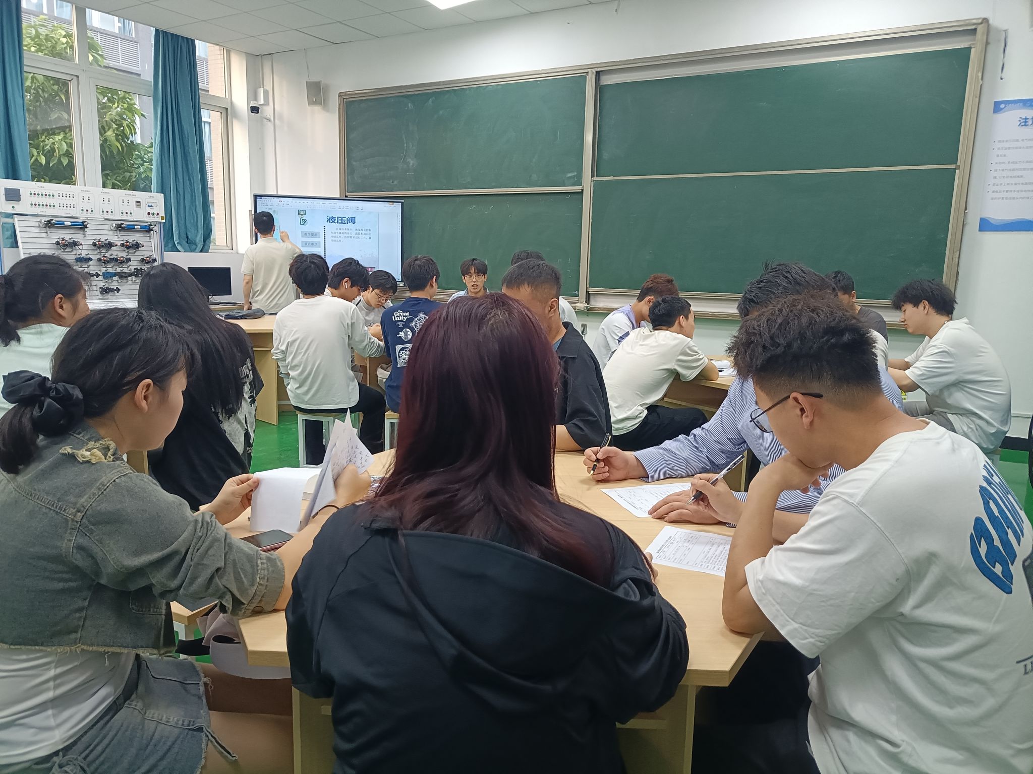 5月8日,在S2304教室开展的《液压与气动》课程磨课活动中,田于财老师以液压阀知识模块为教学重点,采用“结构剖析-原理演示-实际应用”的教学主线,通过单向阀实物演示、液控单向阀对比讲解、换向阀分类解析等方式系统呈现知识要点。特别是结合锯床升降机构的换向阀应用中位机能分析,以及电磁换向阀实物图的动态工作过程展示,实现了理论知识与工程实践的有机融合。课程逻辑严谨、案例生动,既突破了教学重难点,又示范了专业课程的教学设计方法,为听课教师提供了可借鉴的教学范式。