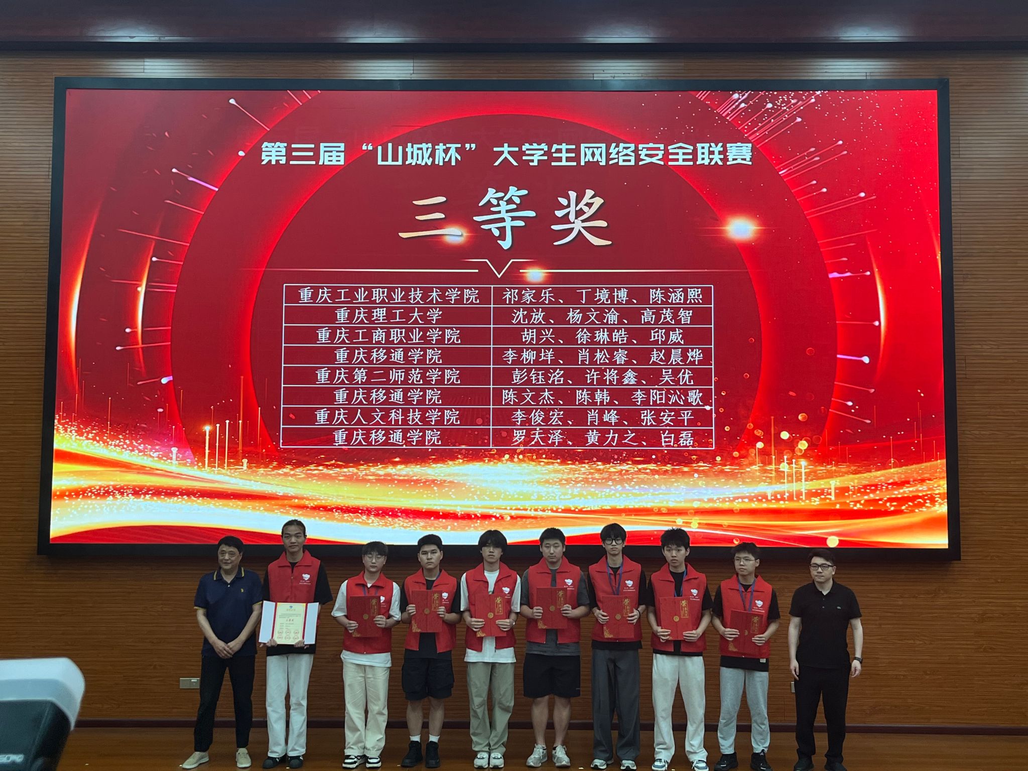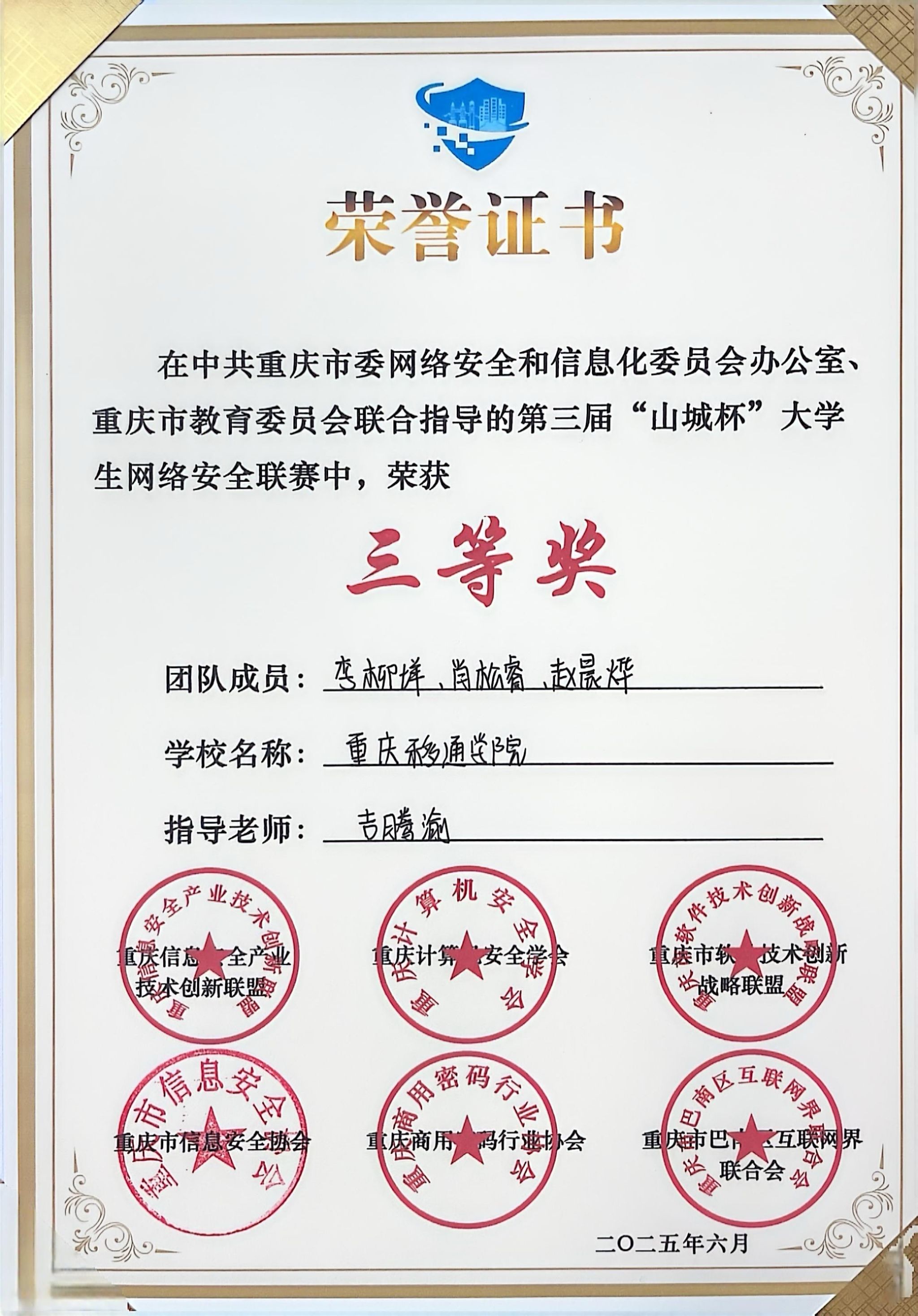 2025年6月6日,第三届“山城杯”大学生网络安全联赛在重庆工程学院圆满落下帷幕。我校綦江校区网络与信息管理中心綦剑网盾战队,代表重庆移通学院参赛,在来自重庆22所高校、82支队伍、240多人中,荣获重庆市三等奖。