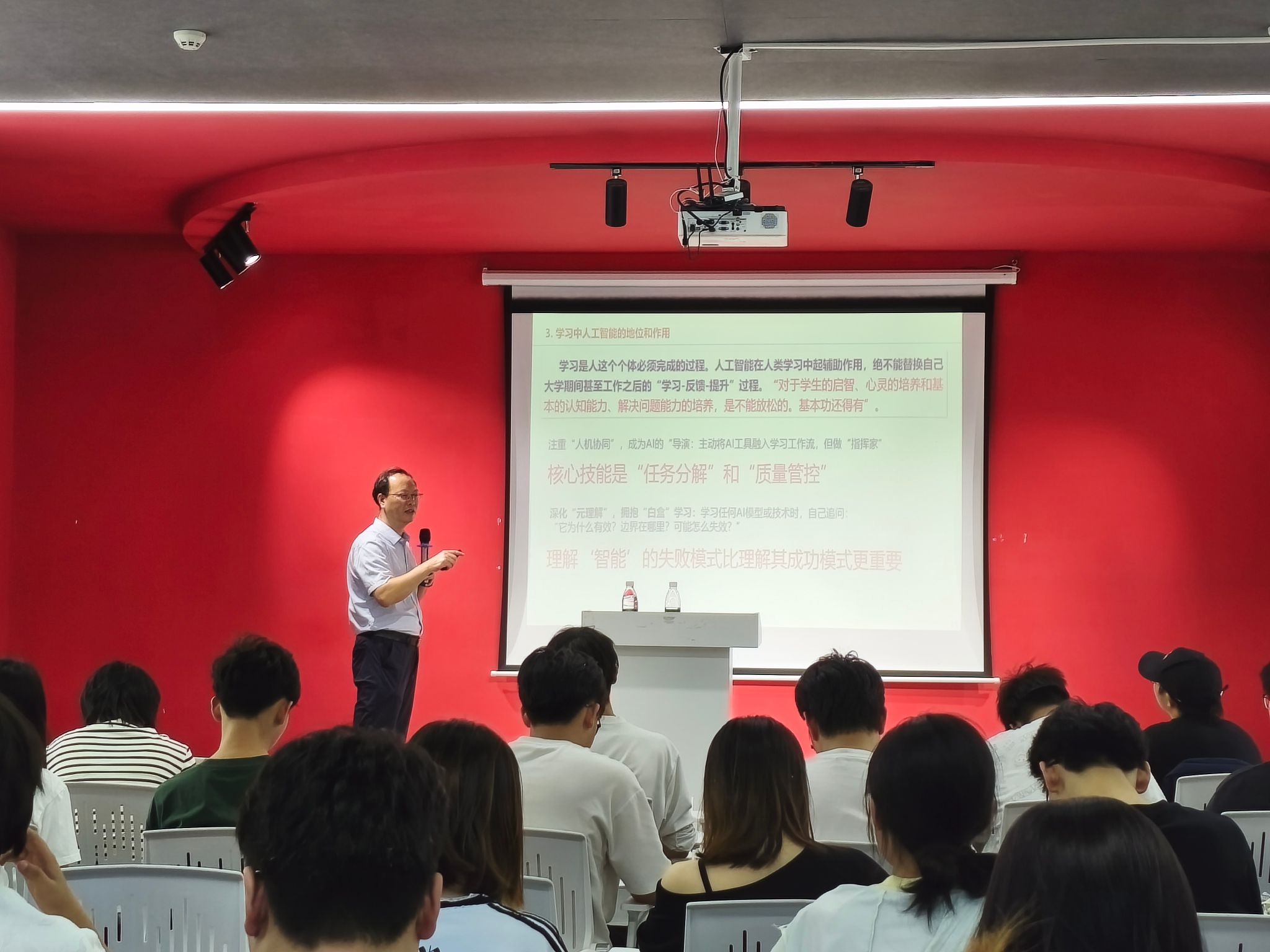 2025年6月11日下午四点,在玉棠书院Talking演讲中心,重庆大学数学与统计学院副院长李东教授带来“人工智能时代大学生应如何学习”为主题的讲座分享。本次讲座以“坚守育人初心,拥抱技术革新”为基调,深入剖析 AI 时代教育生态的转型与学习模式的重构。