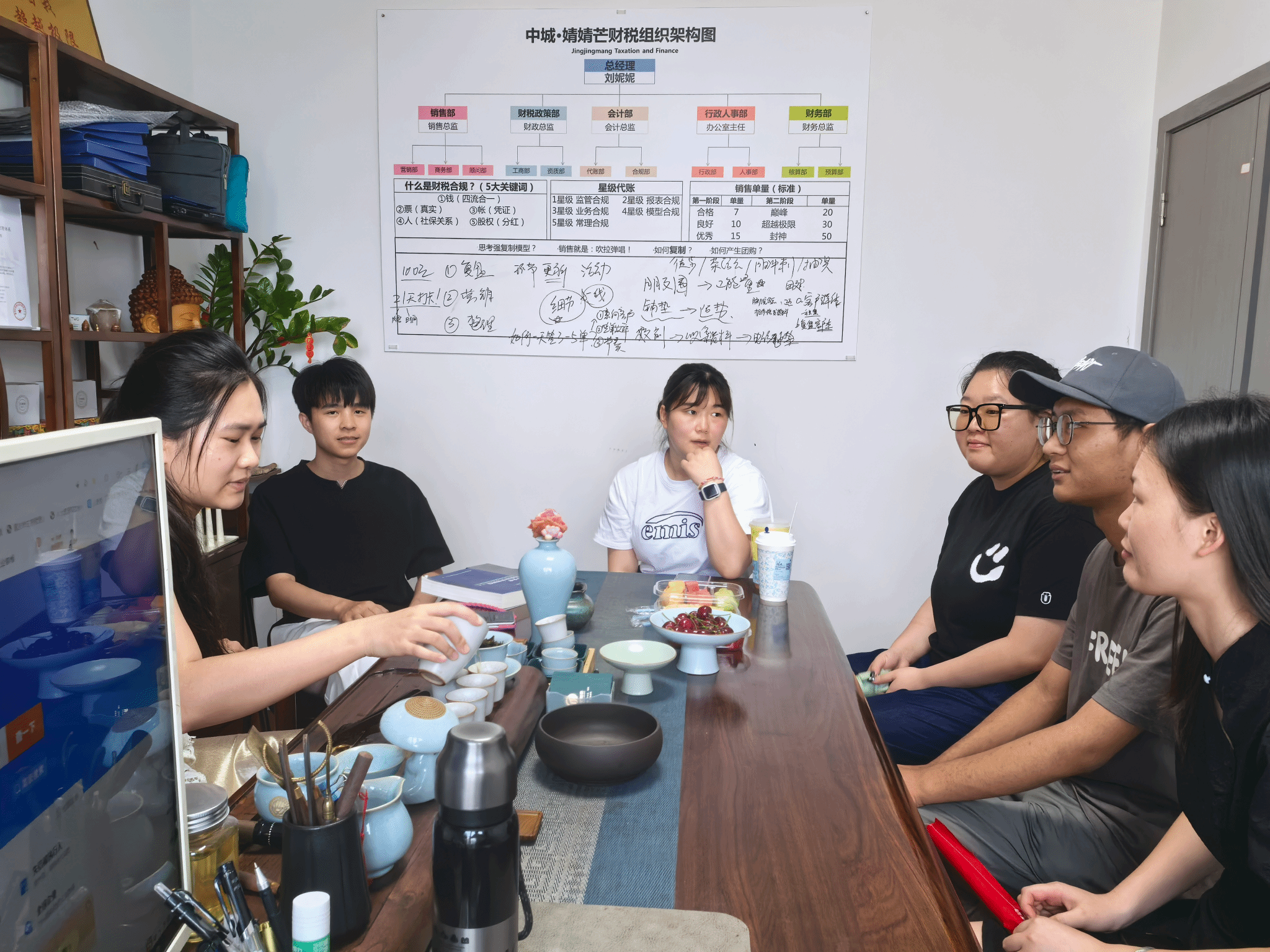 工商管理教研室教师王偲、常世萌及项目组学生成员,与婧婧芒企业管理有限公司执行董事兼总经理陈玉峰、监事刘妮妮及核心业务团队展开深入交流。婧婧芒公司作为一家专注于企业管理、知识产权服务及工商登记代理的综合性企业,在商标代理、税务合规及中小企业数字化转型领域积累了丰富经验。