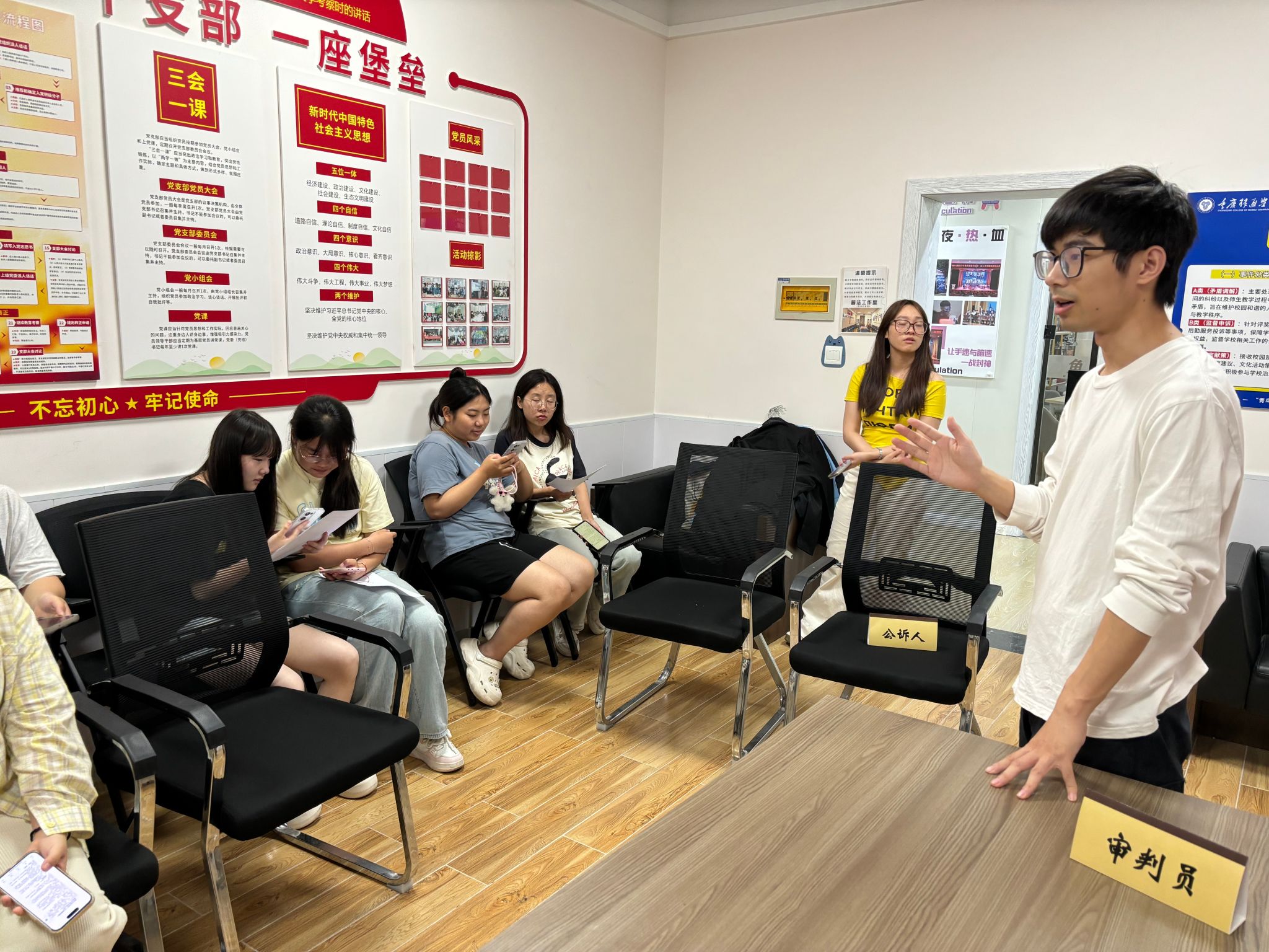 活动伊始,张睿老师为同学们详细讲解了法庭庭审的基本流程和规范要求,并将参与学生分为三个小组。从法庭布置、角色分配到审理程序,张老师都做了细致安排,确保每位参与者都能准确把握自己的角色定位。模拟法庭不是简单的角色扮演,而是对真实司法过程的严谨还原。张老师强调,“同学们要在遵守法律程序的前提下,深入体会每个法律环节的意义。”