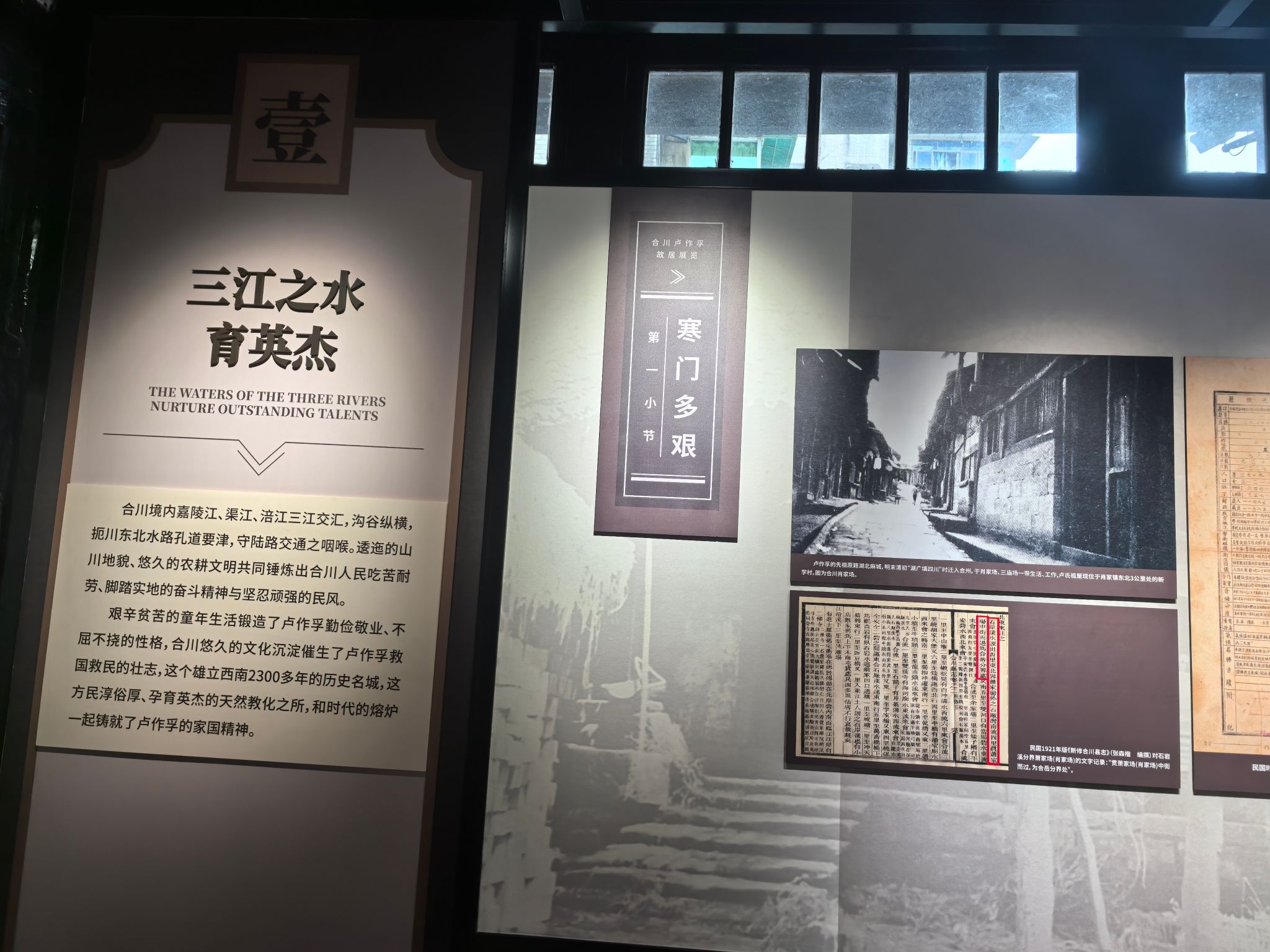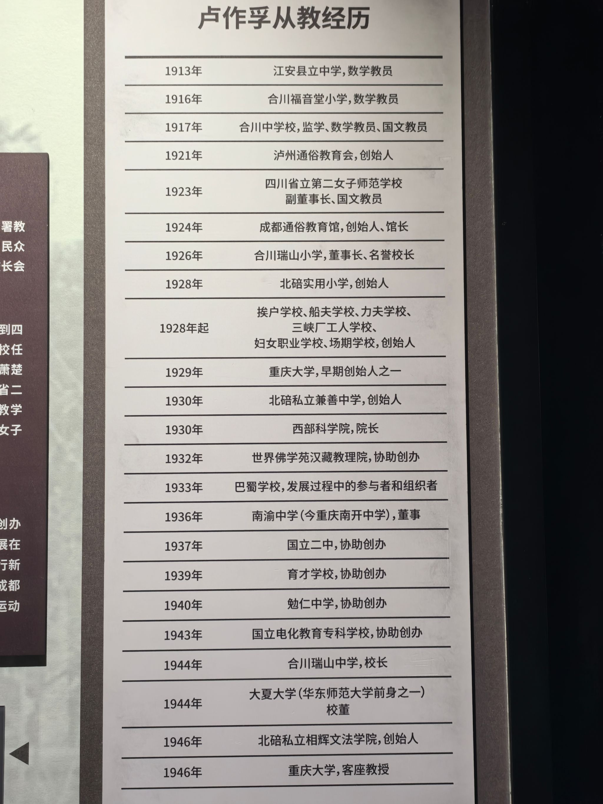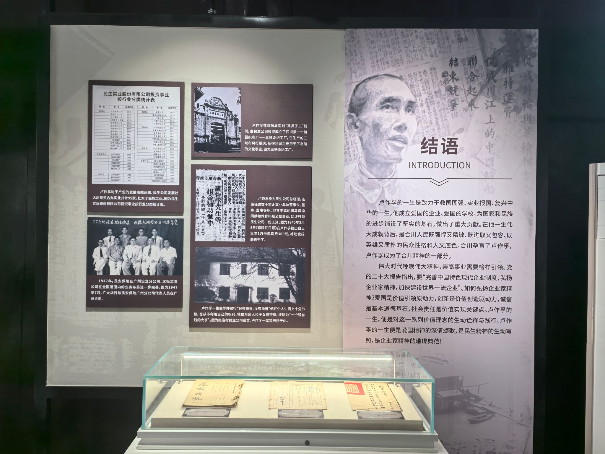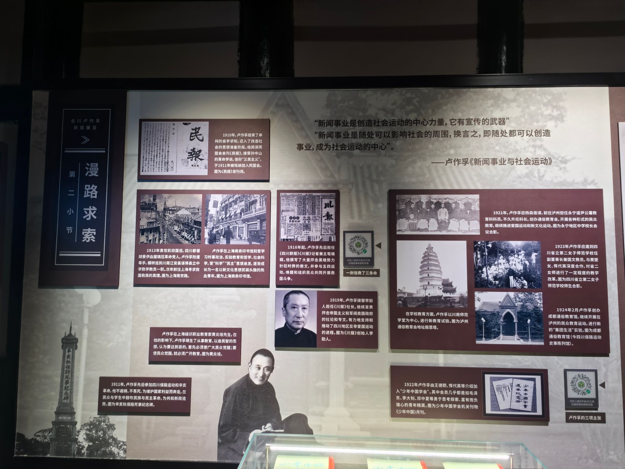 在参观过程中,老师们首先被故居外的展板吸引。展板详细介绍了卢作孚先生的生平事迹,包括他的教育求索、抗战救国、乡村建设以及爱国情怀等内容。这些展板不仅展示了卢作孚先生的伟大精神,还激励着每一位参观者为民族自强与社会进步贡献力量。