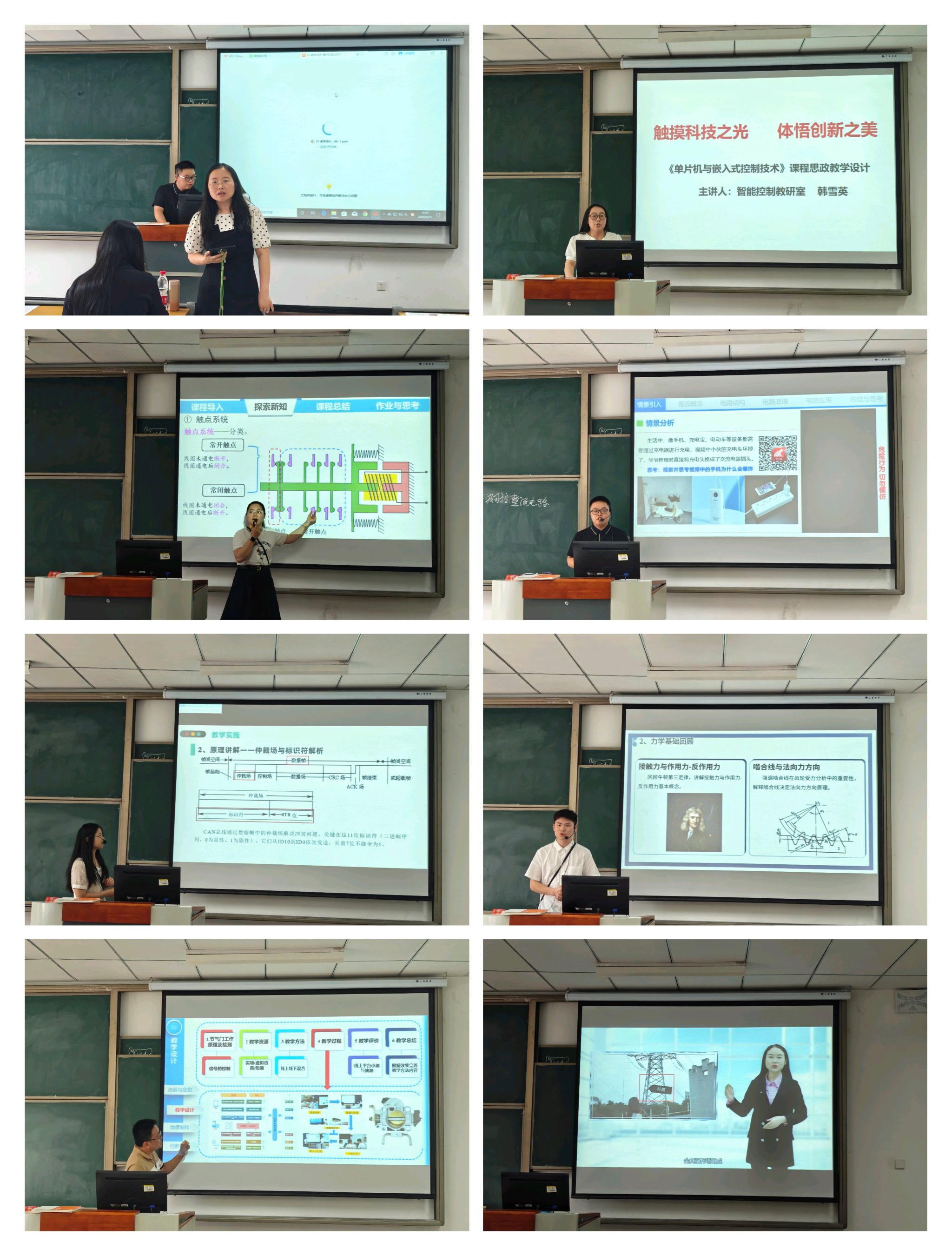 其中,韩雪英老师在讲授《单片机与嵌入式控制技术》时,通过四大环节——教学分析、思政融入、教学设计、教学反思,对课程内容进行了详尽阐述。并通过流水灯工作原理、延时函数的使用、流水灯的实现讲解了单片机I/O口的应用。赵晓玲老师的授课内容《电气控制与PLC技术》以地铁屏蔽门的开关门作为课程导入,讲解了交流接触器的结构、工作原理及应用,理论实例环环相扣,课程思政融入恰当,教学过程结构清晰,教学内容重难点突出,逻辑条理清晰,使学生轻松掌握PLC工作的相关知识点。王玲老师在《单相半波可控整流电路》课程中精心设计了虚实融合的教学情境,通过动画演示与电路原理图的逐层解析,将交直流电转换的核心原理拆解为可视化、可理解的知识模块,以深入浅出的方式带领学生掌握技术内核。课堂中特别融入生活化案例——以手机充电器中的整流电路为切入点,直观呈现理论知识在实际电子设备中的具体应用场景,有效架起了抽象理论与工程实践的桥梁,切实激发了学生对专业内容的学习兴趣与探索热情。盛顺利老师在讲授《CAN总线仲裁机制——智能汽车的“通信裁判”》的过程中,运用多媒体动态演示与情景模拟相结合的教学模式,以刹车、车载音乐和车载来电三指令同时发送,谁先被执行的问题作为导向,结合仲裁场与标识符的原理剖析,详细讲解了CAN总线仲裁机制的核心知识点,极大提升了学生的学习兴趣。胡云川老师在授课中详细讲解了《齿轮受力分析》的原理和应用,其中涉及两个重要的知识点:一是接触力与作用力;二是啮合线与法向力方向,这两个力学基础作为课程的关键切入点,有助于我们更好地理解和把握齿轮受力特性。邓长勇老师在讲授《节气门位置传感器的结构原理与检测方法》时,通过选题与定位、教学设计、微课制作和创新特色这四个环节,对节气门工作原理进行阐述。他巧妙地将枯燥的理论知识转化为直观易懂的知识图谱,使整个教学过程既深入又浅出,让学生能够较为轻松掌握节气门工作原理及检测。董蕾老师在讲解《电力天路——架空路线》时,首先介绍了架空路线由避雷线、导线、杆塔、绝缘子和金具组成,其次分析了电阻、电抗、电导和电纳对输电线路的影响,最后介绍了架空线路的应用,将原本晦涩难懂的理论知识进行了具象化的转化,使学习过程变得更加直观和有趣。比赛现场精彩纷呈,各教研室教师积极观摩学习,形成了良好的教学交流氛围。