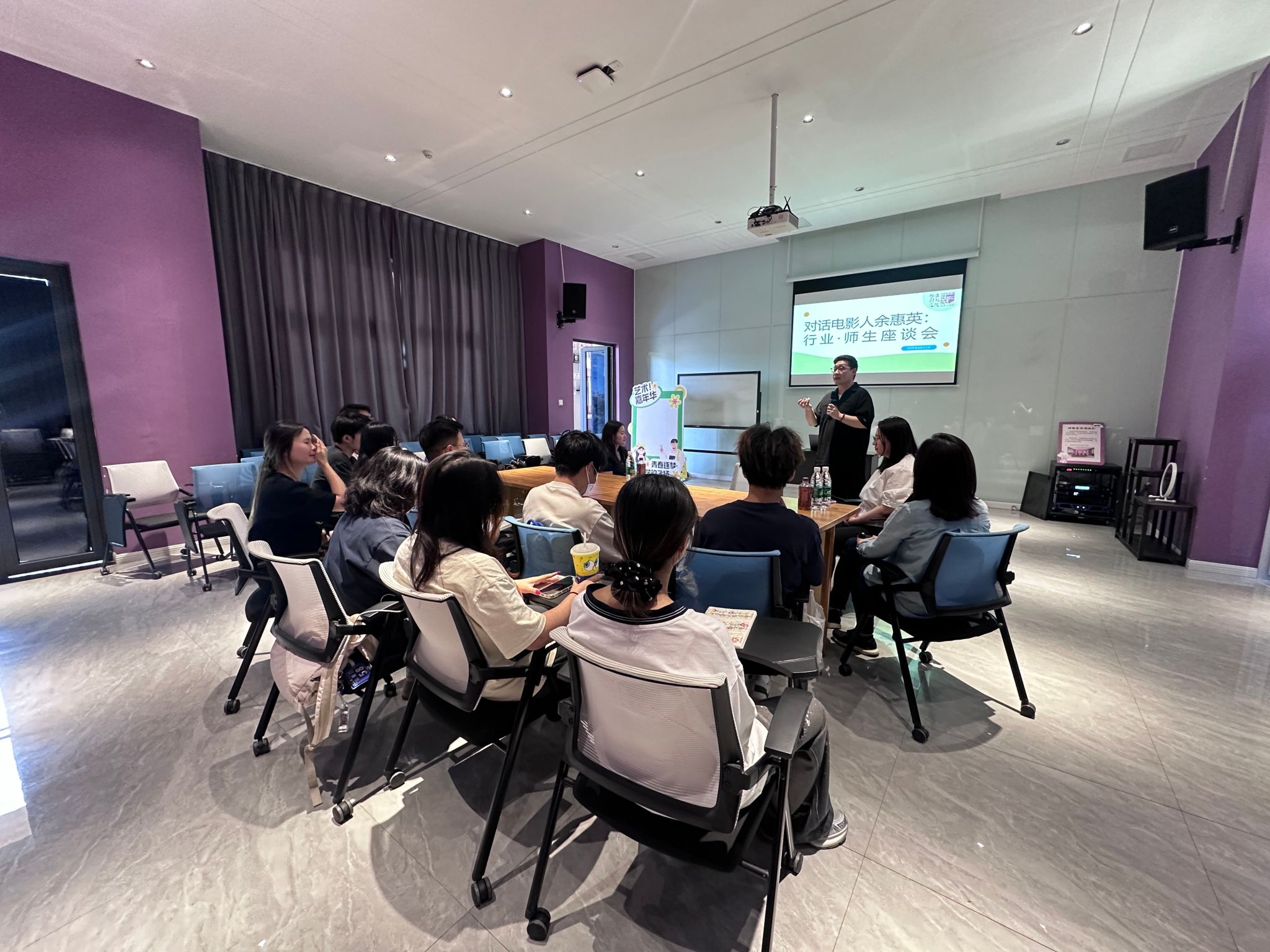 为助力影视行业人才培养,拓宽戏剧影视文学专业学生的创作视野,2025年6月11日下午1点,移通学院观云书院立冬·朋辈交流空间座无虚席。戏剧影视文学专业师生共同对话资深电影人、制片人、作家、编剧、短剧人余惠英。