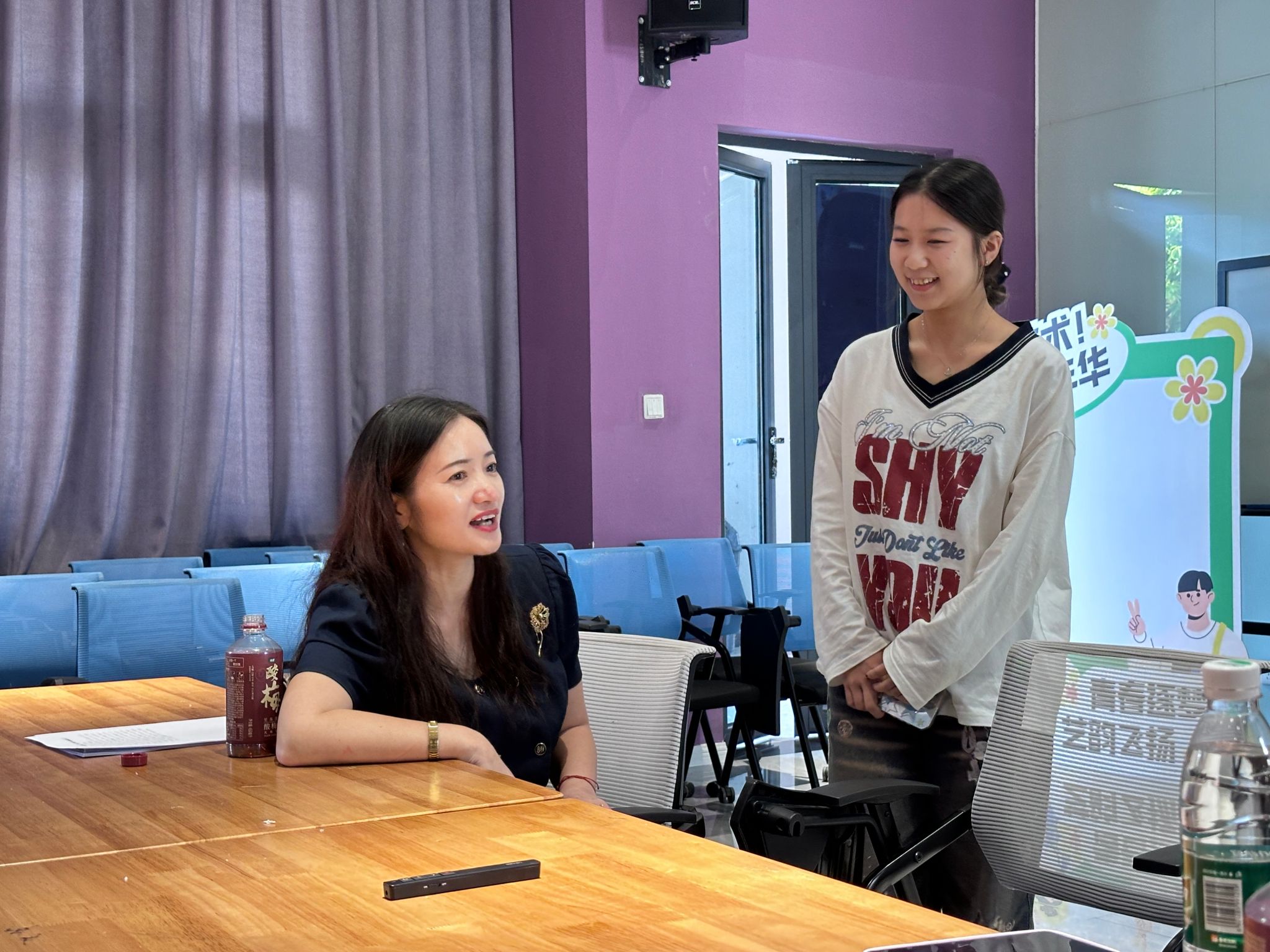 在互动交流环节,现场气氛热烈。戏剧影视文学专业的学生们踊跃提问,围绕短剧创作的艺术与商业平衡、拍摄实践、工作室发展方向等话题与余惠英展开深入探讨。影视文学与美术教研室主任杨帆、戏剧影视文学专业负责人郭嘉琦以及骨干教师邬眉扬、廖雪雅也积极参与讨论,分享了他们在教学与实践中的经验与困惑。余惠英耐心解答,以其深厚的行业经验、跨学科的学术背景以及丰富的实战案例为师生们答疑解惑。她鼓励同学们“完成比完美更重要”“选择比努力更重要”,并分享了自己在短剧创作中的冒险与尝试。