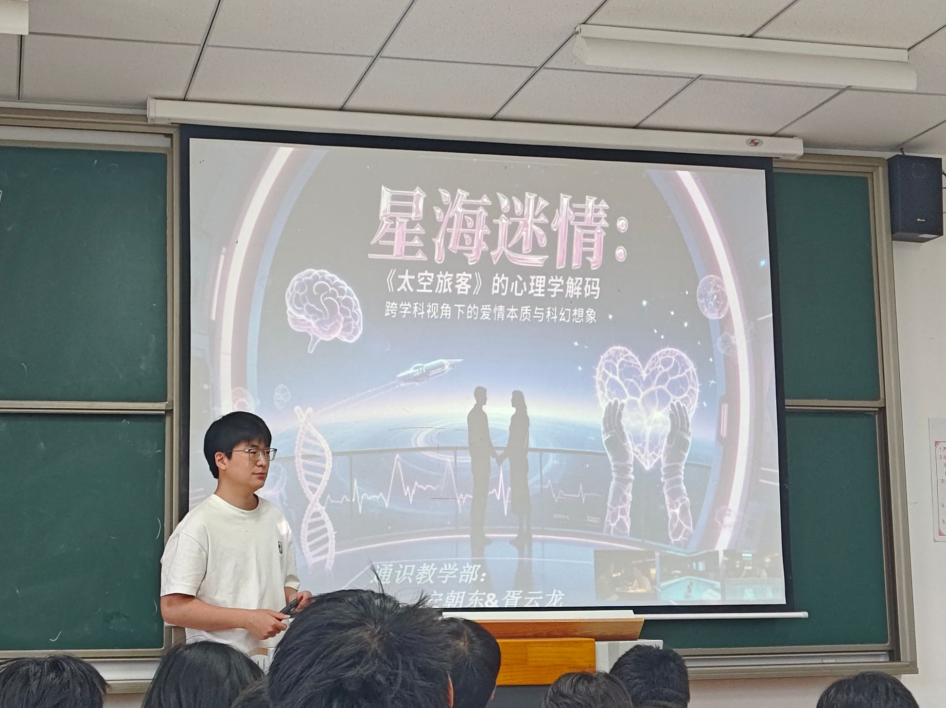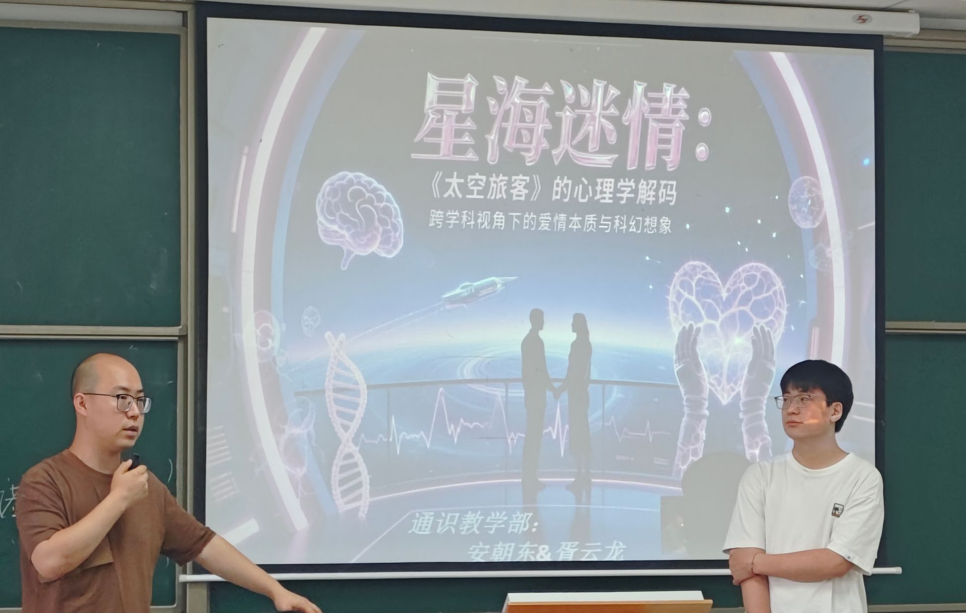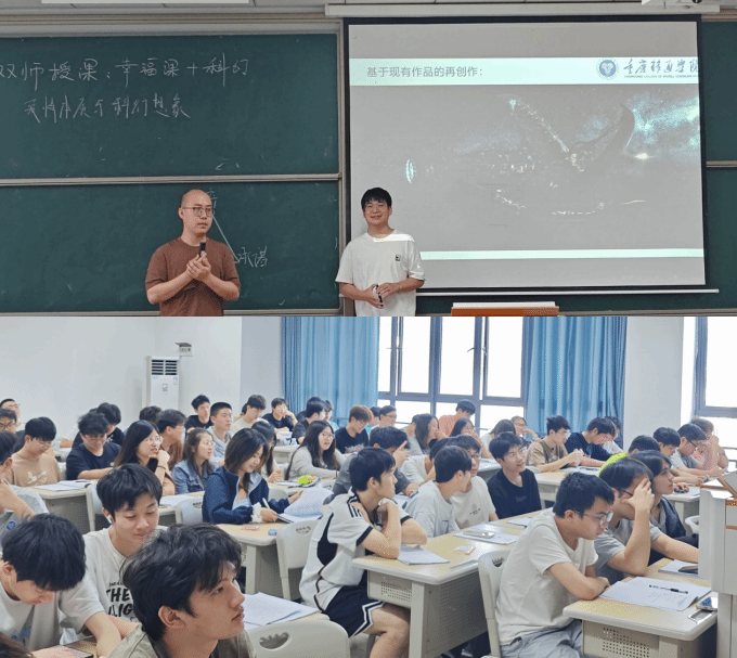 5月29日下午,在仁者楼408教室,《幸福课》安朝东老师与《科幻与想象》胥云龙老师进行了双师授课。他们以科幻电影《太空旅客》为案例,引导学生探讨心理学中的爱情理论,同时进行科幻想象的创作。