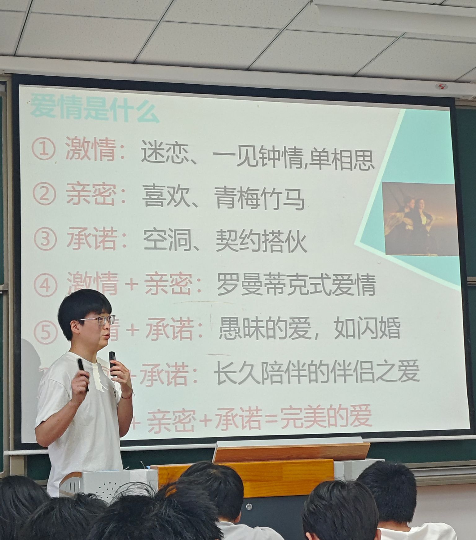 课程开始,安朝东老师通过学习通平台提问“什么是爱情?”,并从生理激素、社会现象和心理学定义等角度进行解析。他重点介绍了耶鲁大学斯腾伯格的“爱情三成分理论”:激情、亲密和承诺。胥云龙老师随后播放电影片段,生动展示了这三个概念。