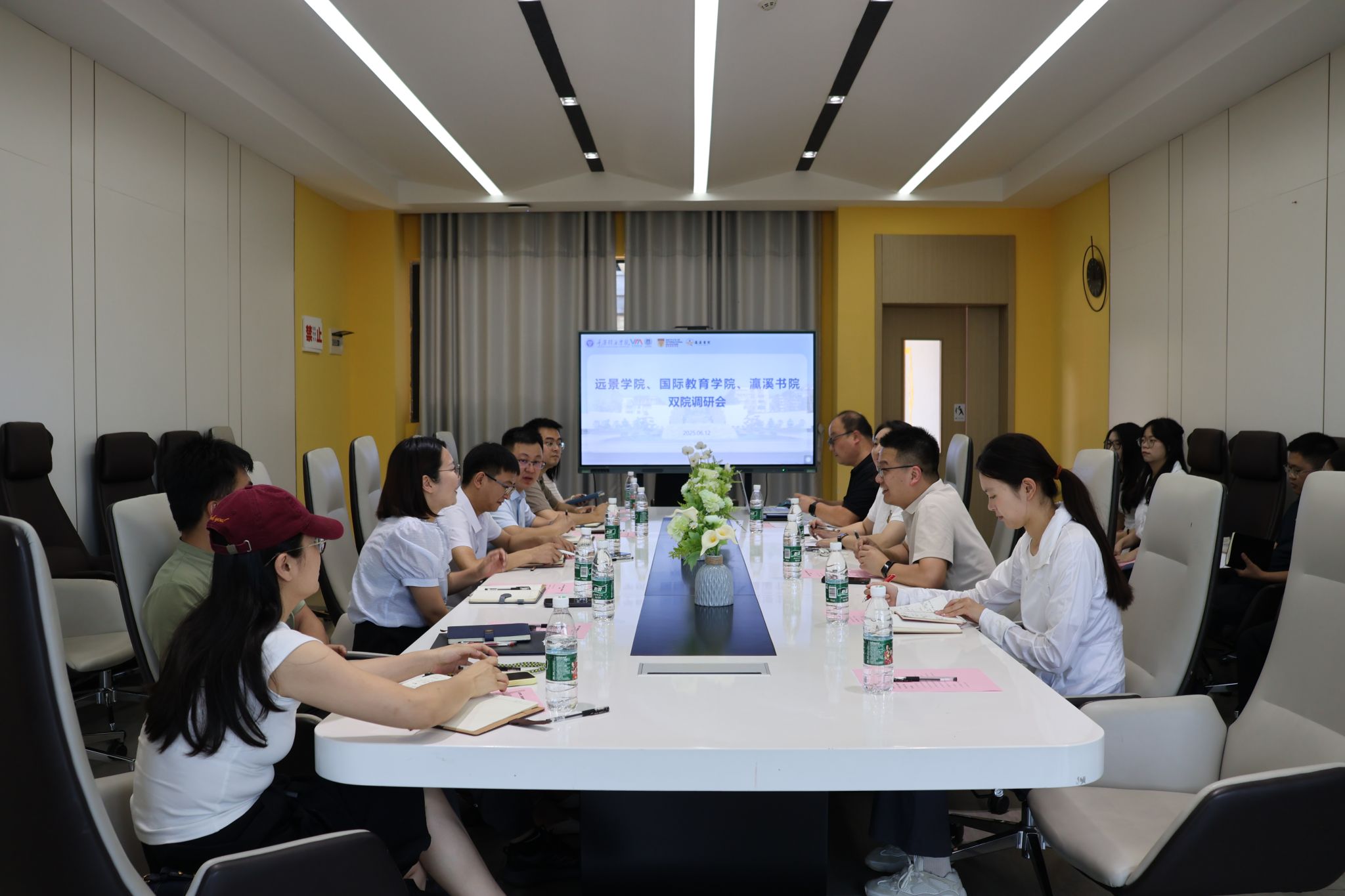 2025年6月12日下午14:30,远景学院、国际教育学院、瀛溪书院双院调研会于瀛溪书院一二三亖会议室召开。副校长李文豹、校长助理梁少锋、学生处副处长唐尚静、书院部部长曹玉姣、艺术教育中心主任程燕、竞技体育中心副主任江华、就业创业指导与服务中心副主任毛敏等领导莅临指导,远景学院、国际教育学院副院长、学工团队全体老师参会。会议由远景学院教学副院长强杨主持。本次会议各方围绕双院育人实践、资源整合及特色发展深入交流,为构建高质量育人体系凝聚智慧。
