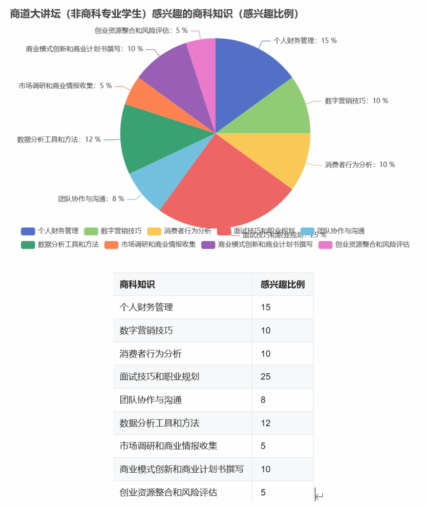 为了增强学生在讲座中的参与感,我们会及时收集学生的反馈意见,了解学生的收获与期望。本学期共收集到有效反馈问卷 870来份,根据学生的反馈,我们会对讲座的时间安排、主题选择等方面进行了优化调整,尤其是对于非商科专业学生感兴趣的商科板块内容进行更多引入,进一步提升讲座的质量与效果。