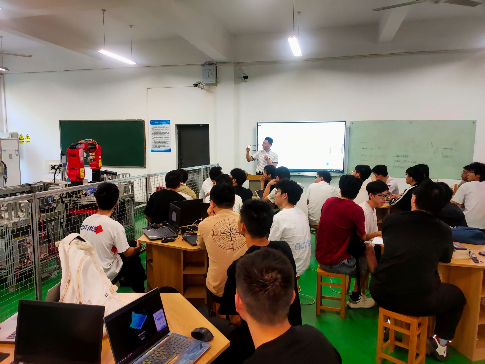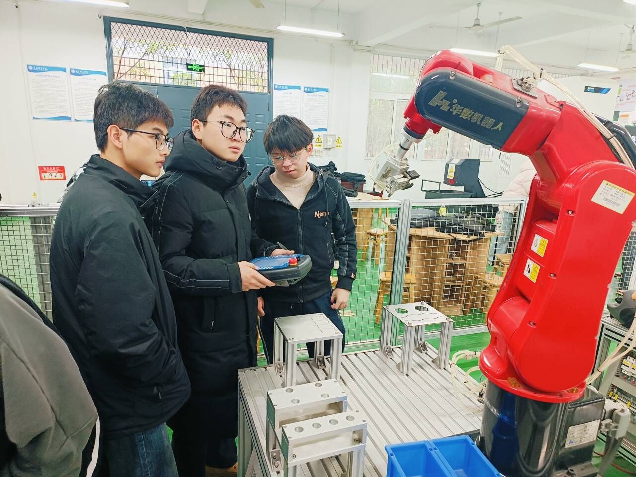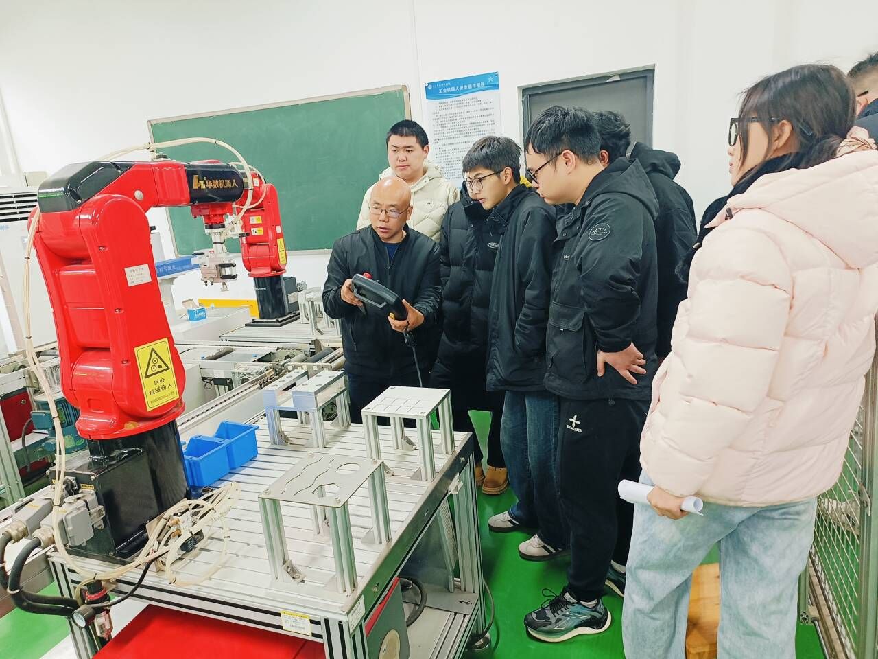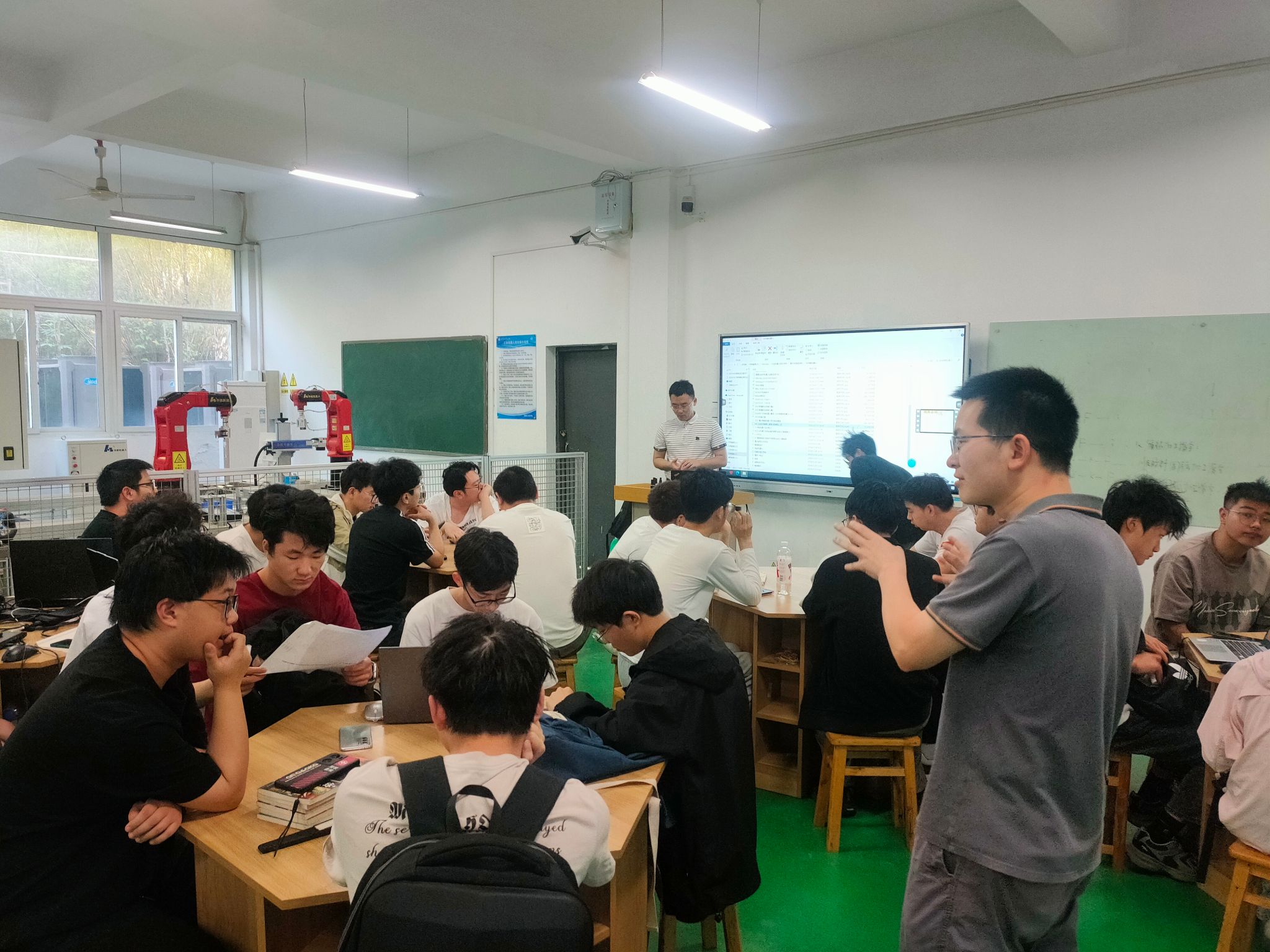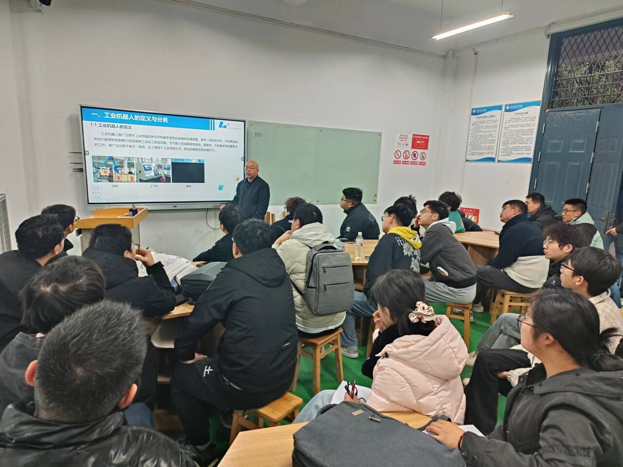 3月30日至31日,在《机械制造项目实践》课程中,重庆华数机器人有限公司工程师陈晓峰以其深厚的工业机器人应用经验,为课程带来大量一线典型案例,重点引导学生掌握机器人编程、产线调试等核心技能。课程实训任务围绕自动化单元的搭建与调试展开,学生在实践中需独立完成从零件选型到程序编写的全过程。面对机器人精准抓取与码垛过程中程序频繁报错等技术难题,陈晓峰工程师以专业判断引导学生优化参数、调整策略,有效解决关键瓶颈。校内教师牛亮与尹超林积极配合,提供理论教学与教学组织支持,两位教师均具备丰富教学经验并曾参与企业挂职锻炼,保障了课堂内容与产业实践的高度契合。
