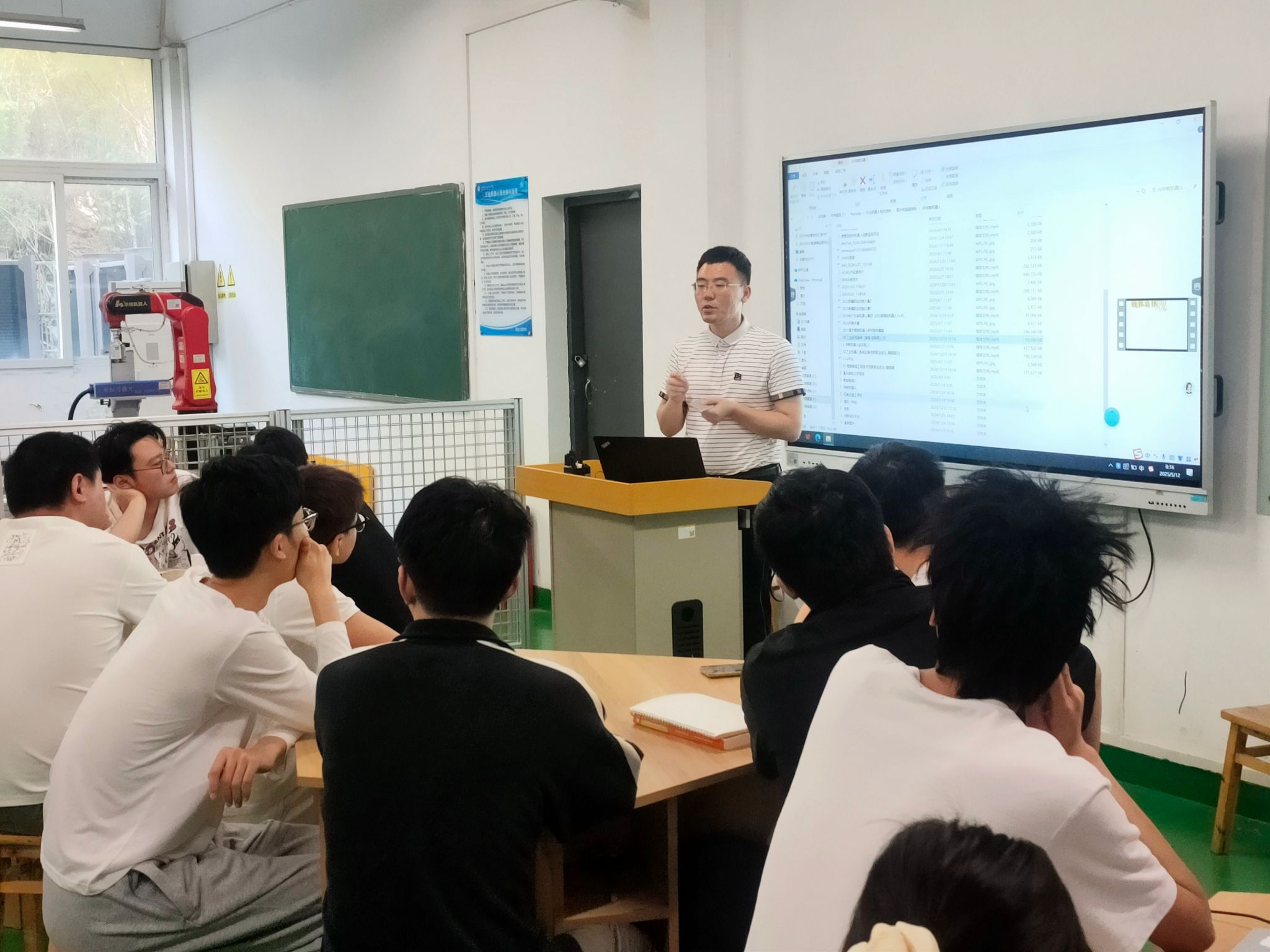 5月12日,在《工程工艺项目实践》课程中,重庆华数机器人有限公司的郝宗洋工程师深度参与课程设计与实施。他凭借丰富的工程项目经验,系统讲解智能产线工艺流程、AGV调度系统及视觉检测技术,在多个任务环节中引导学生直面工艺参数优化、节拍平衡等工程难题。在“毛坯入库—智能加工—成品分拣”全流程仿真实训中,郝工程师手把手指导学生完成路径规划与系统集成,帮助其构建完整的工艺认知体系。校内教师田于财与王朝东在课程中发挥重要作用,协助组织教学任务,补充专业理论内容,并在实验环节提供技术支持,助力学生高效完成多工艺融合任务。