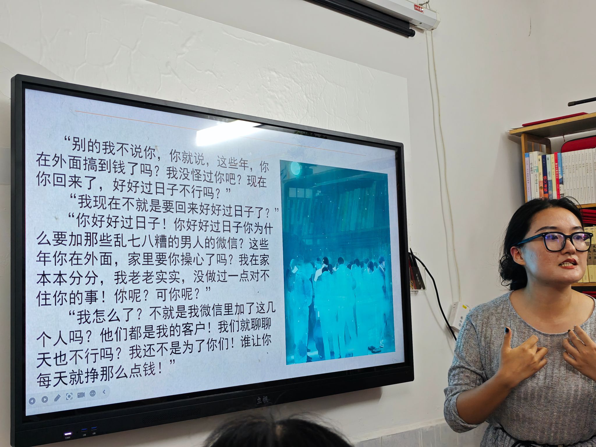 工坊深处突然炸开重庆方言的“枪林弹雨”。谭先锋等两名学生正演绎小说片段——跑外卖的丈夫撞见直播妻子“维护大哥”:
