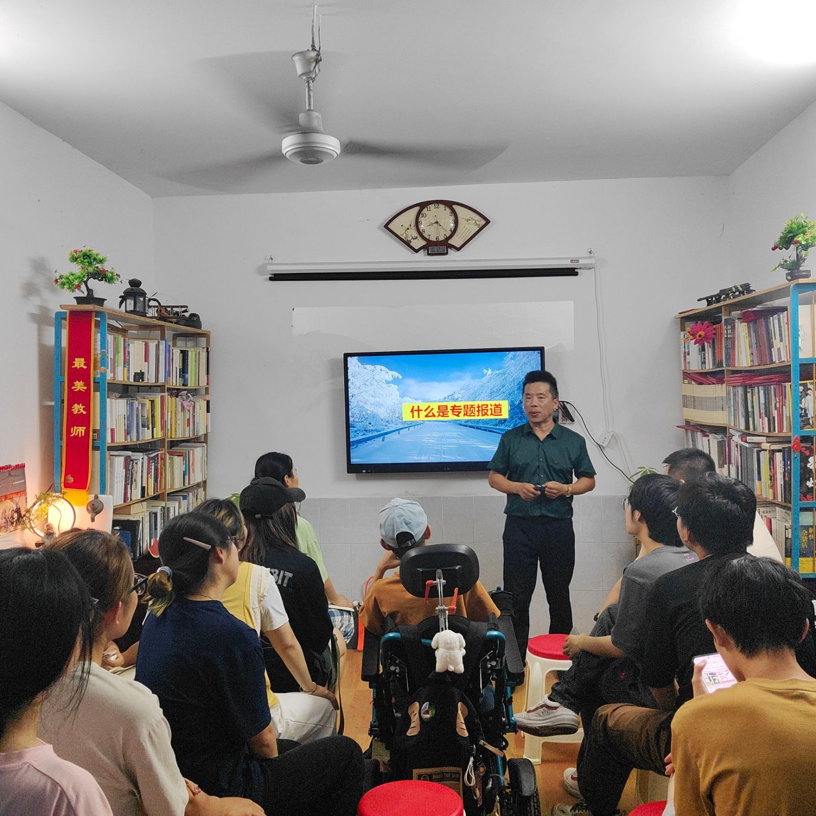 王老师讲的是《什么是专题报道》这一课,他拿航空母舰打比方,周边要配驱逐舰、护卫舰、巡洋舰、潜艇、预警机和战斗机等,专题报道得分五大核心步骤:确定重大选题、构建报道框架、平衡叙事与观点、运用多元素材及优化呈现形式,并配发新闻评论,从而形成一个强大的立体重磅报道。