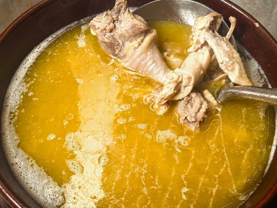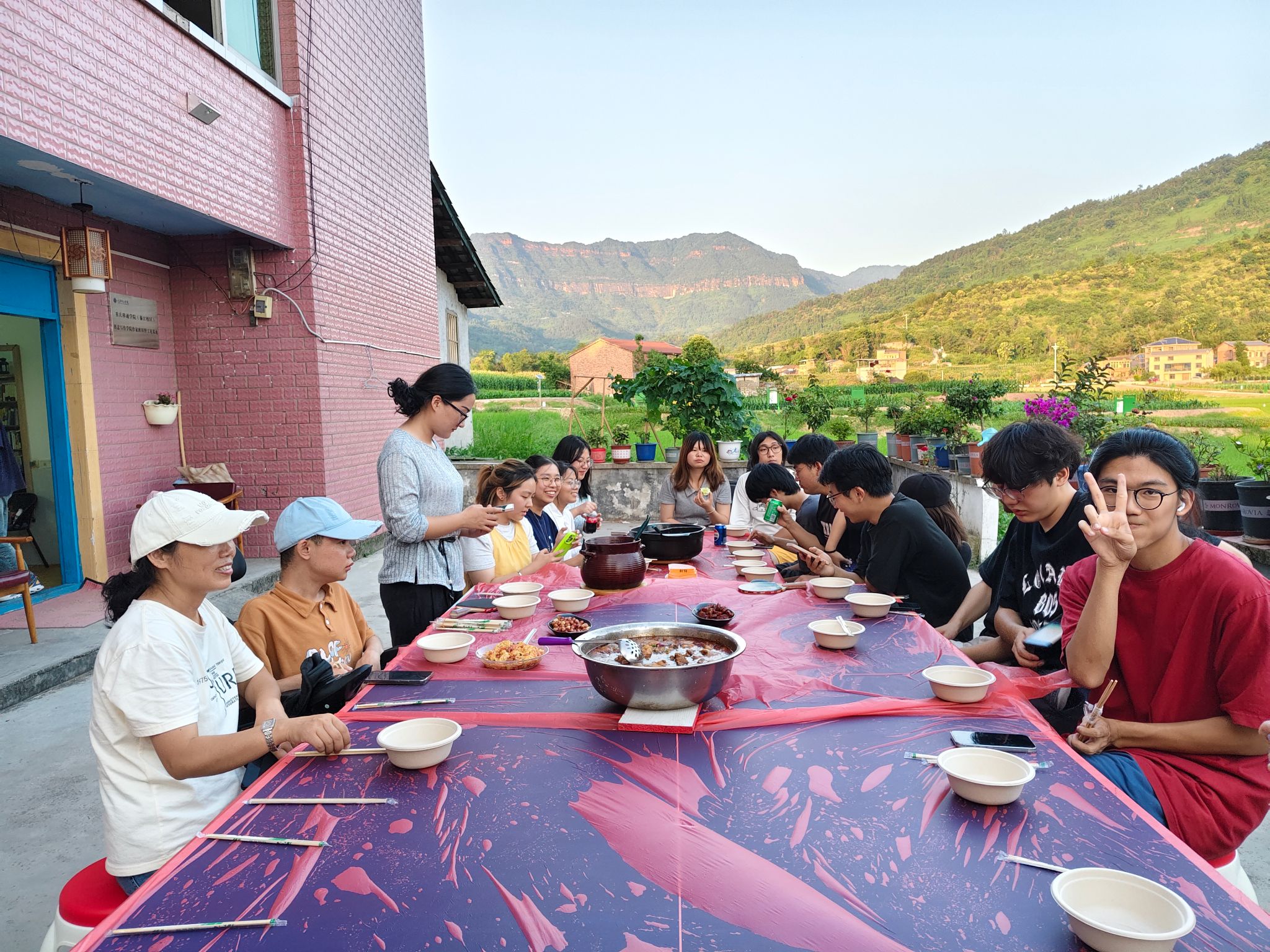 王恒绩老师端着满满当当的鸡汤、红烧肉从厨房出来,二十多双眼睛瞬间被勾住,“这肉好像泛着金光似的!”——肉块炖得酥烂入味,糖色裹着八角香在蒸汽里打滚,配着粒粒分明、卧着金黄蛋碎的炒饭,乒乓台与课桌拼就的长桌上,顿时漫开热辣辣的烟火气。