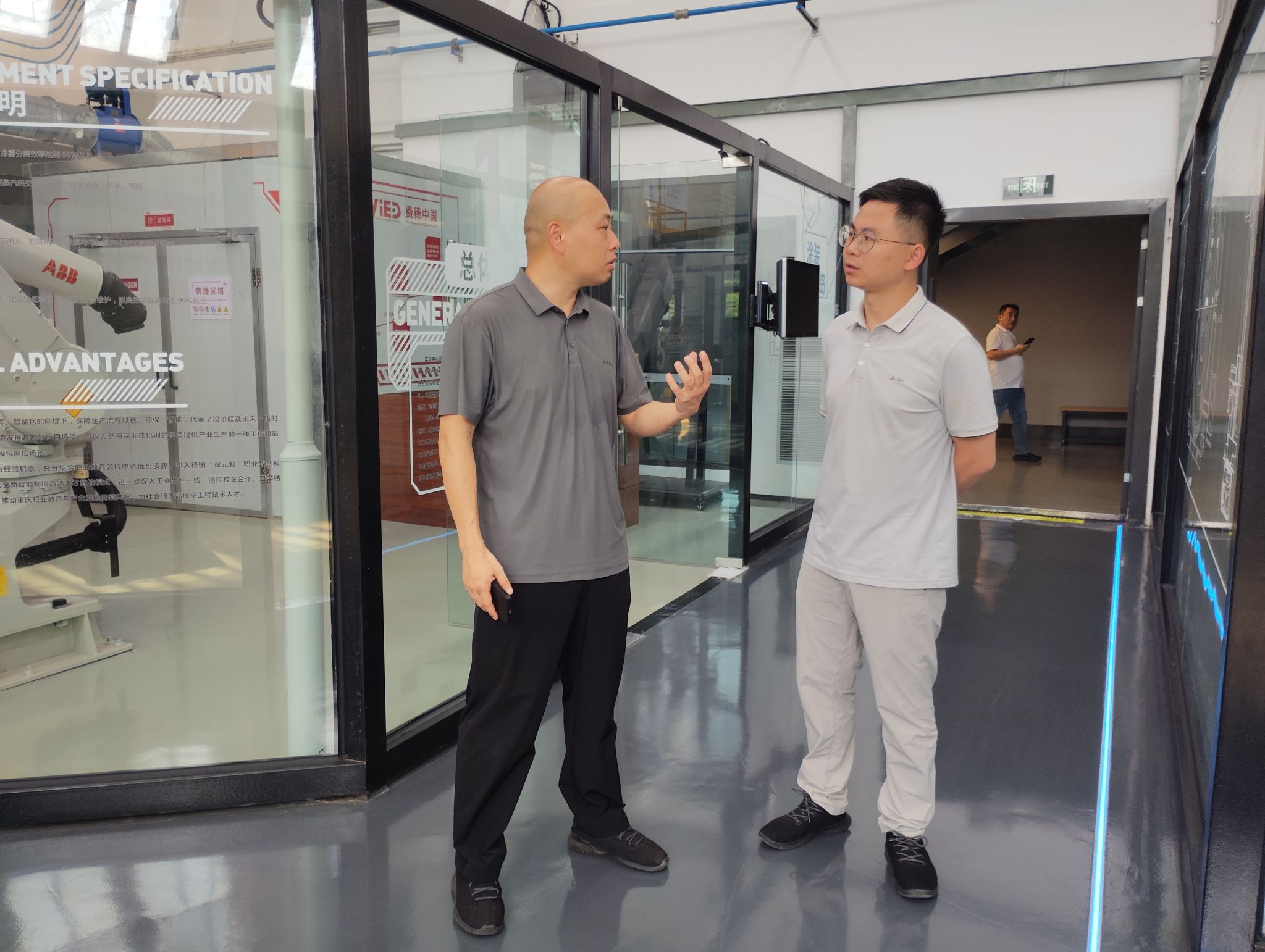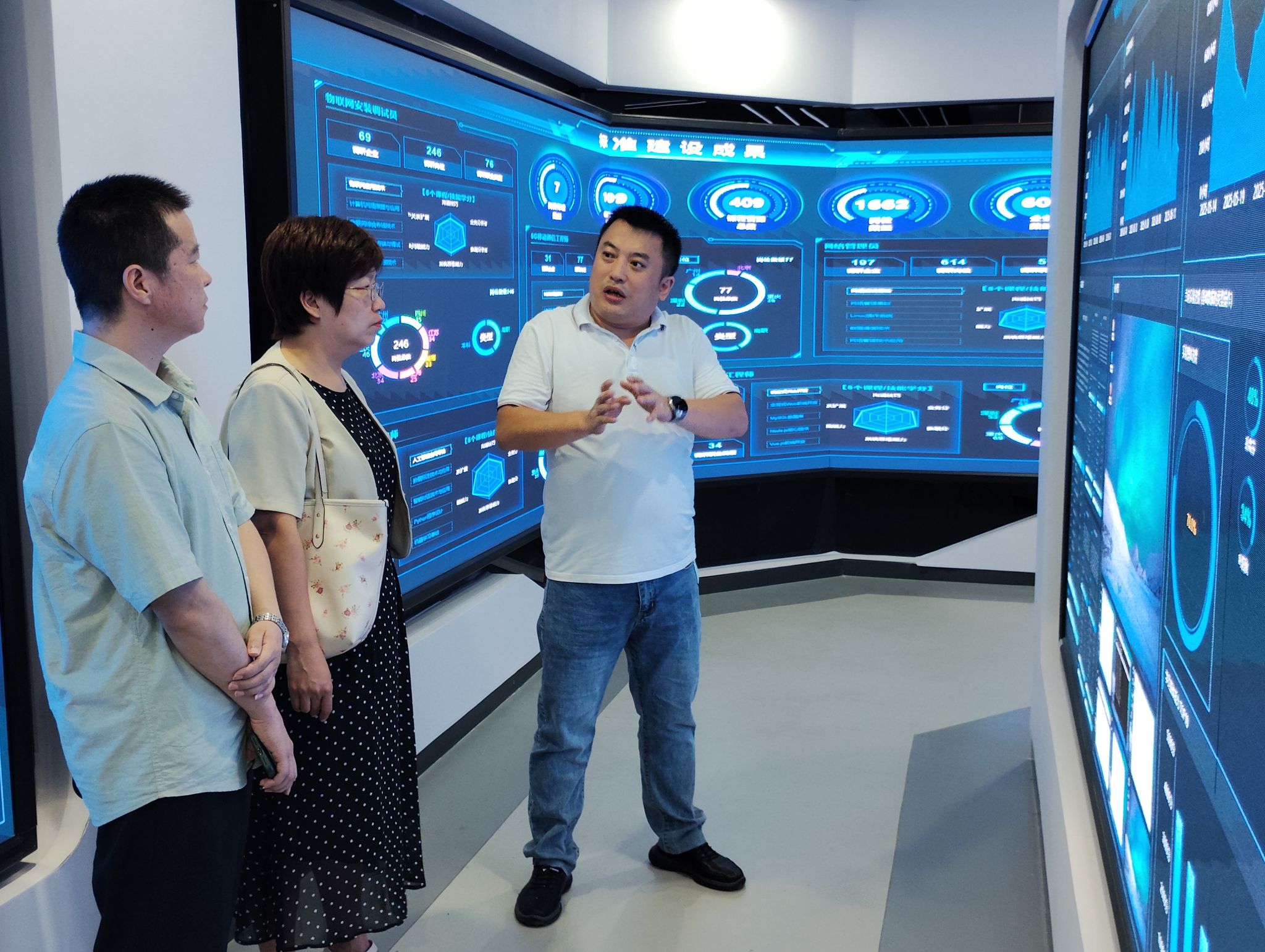 上午9:30,访问团队在企业负责人陪同下参观实训中心,重点考察智能制造、人工智能等技术场景。作为运营五年的国家级实训基地,该中心累计培养 2.8 万余名专业人才,与交通大学等多所高校共建共享实训资源,依托华为云计算、大数据等技术方向开发地方职业标准,形成“政策+企业+ 院校”的协同运营模式。参观过程中,团队体验了 AI 教学平台功能,该平台通过模拟面试、能力画像等技术,帮助学生精准提升职业技能。