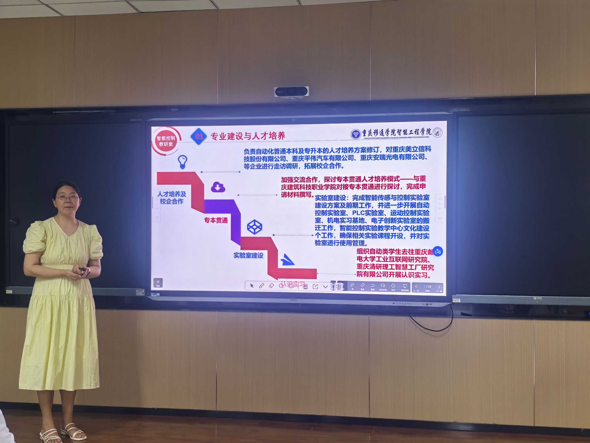 智能控制教研室于6月18日下午2点在9104开展“教研室主任说基层教学”活动。教研室主任张姣老师从教研室的基本情况切入,详细介绍了团队成员构成、师资队伍建设成果。在教学工作方面,张姣主任深入阐述了课程体系构建、教学模式创新及人才培养方案的优化思路,着重强调了将行业前沿技术融入课程教学,培养适应社会需求的高素质智能控制专业人才。随后,张姣主任分享了教研室在科研项目与学科竞赛领域取得的优异成绩。近年来,教研室团队主持参与多项校级科研项目,在多个学科竞赛获得国家级、省部级奖项,同时,教研室积极开展校企合作,与多家知名企业建立产学研合作基地,为学生提供实习实践平台,促进科研成果转化。未来,智能控制教研室将继续发挥专业优势,加强与行业企业的紧密合作,打造特色专业品牌。