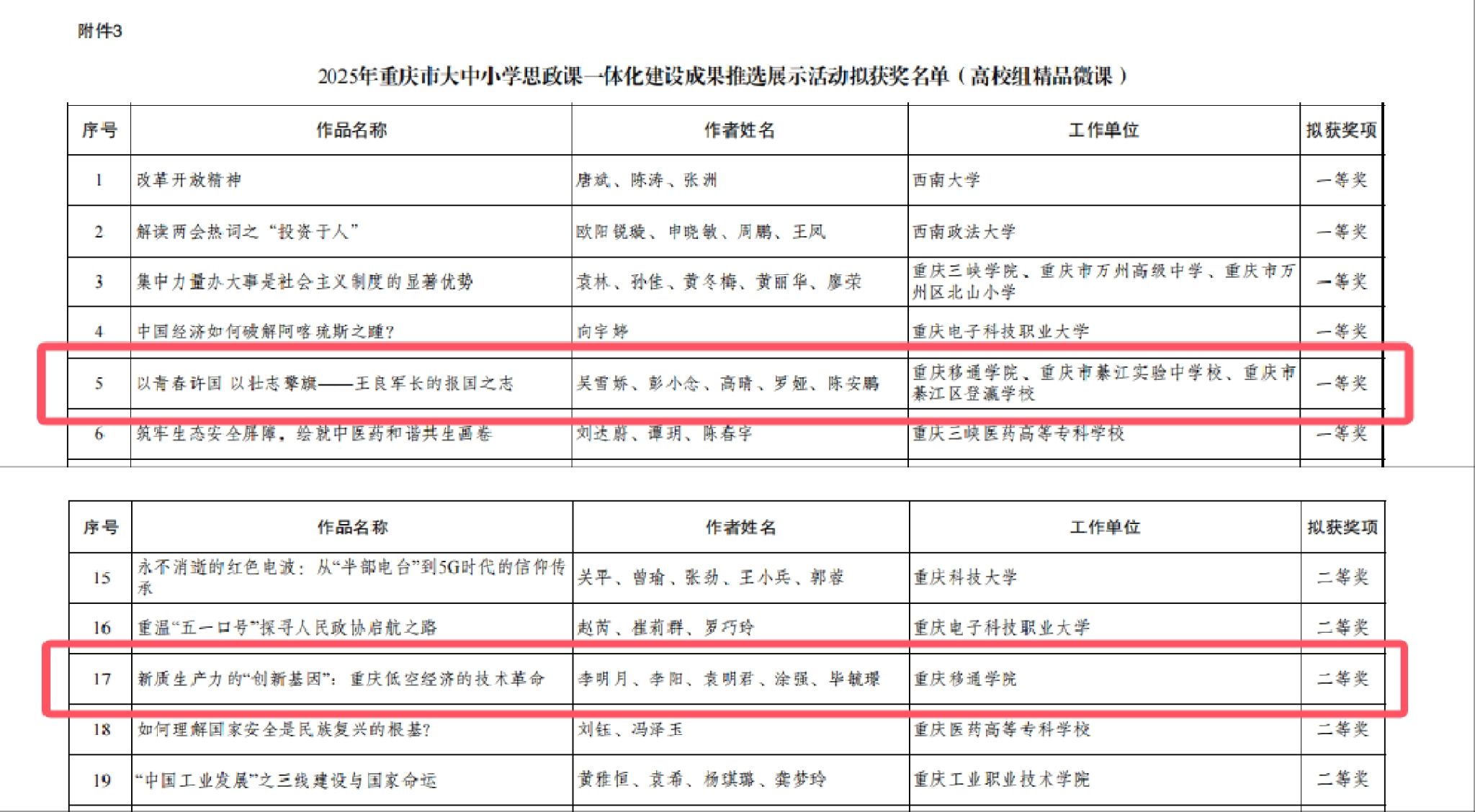 近日,由中共重庆市委教育工作委员会、中共重庆市委当代党员杂志社主办的重庆市大中小学思政课一体化建设成果推选展示活动结果揭晓,我校马克思主义学院吴雪娇老师团队和李明月老师团队的作品分别获高校组精品微课一等奖、二等奖。