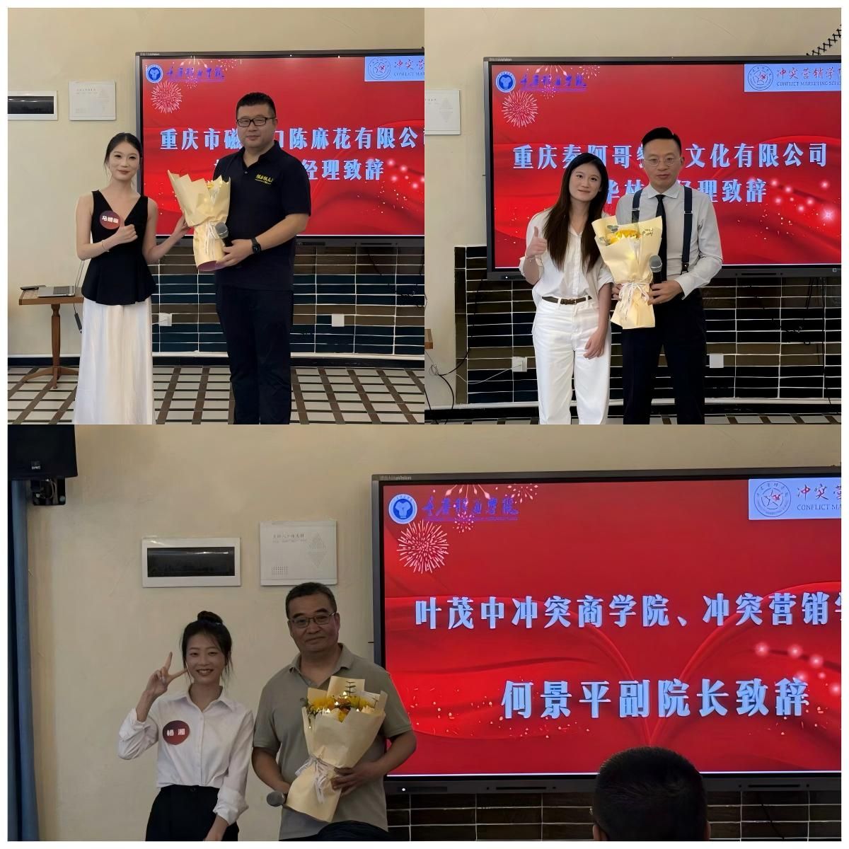 6月21日,重庆移通学院冲突营销学院迎来了一场意义非凡的盛会——第二届精英班实训项目品牌营销策划评审会暨结业颁奖典礼。出席此次活动的评委及嘉宾有:冲突营销学院副院长何景平,重庆陈昌银麻花有限公司总经理杨学武、总经理助理王锋,重庆秦阿哥餐饮文化有限公司总经理秦华林,重庆致微科技有限公司总经理杨云,重庆市荷花米花糖(集团)有限责任公司总裁助理黄国文、销售部长唐云川,冲突营销学院主管董道进,市场营销教研室教师孙可可、张锦文、寇小玲、唐思蓉、潘泉宏,以及精英班全体学员。活动由冲突营销学院主管董道进主持。