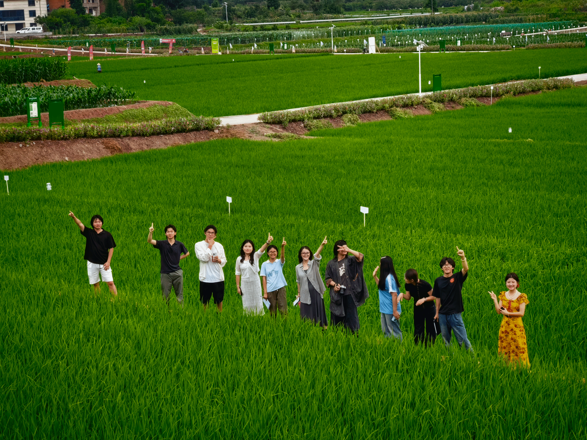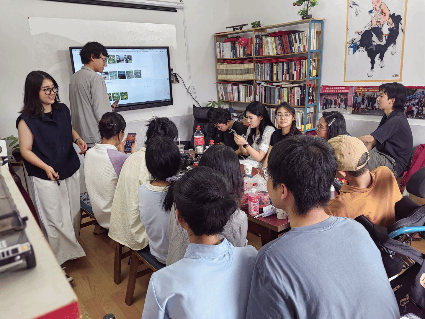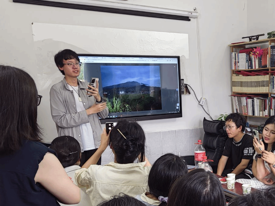 屈涵同学的分享则妙趣横生,他抓拍到曾宇海同学在山坡摆姿势的瞬间,并配文“力拔山兮气盖世,”以幽默视角诠释“写生”的多元可能,同学们调侃到这是真的“写生”了。杨莹同学镜头下“品相优36”的试验田标牌,牵出家乡因试验种子引发纠纷的往事,让她在对比中感悟到正规农业科研的严谨。杨宇辉同学则将上次录的蛙鸣与此次观察融合,创作出《原野的啼鸣》,以“由远及近、由静至动”的笔触,让原野的生命力在文字中跃动,收获了满堂喝彩。