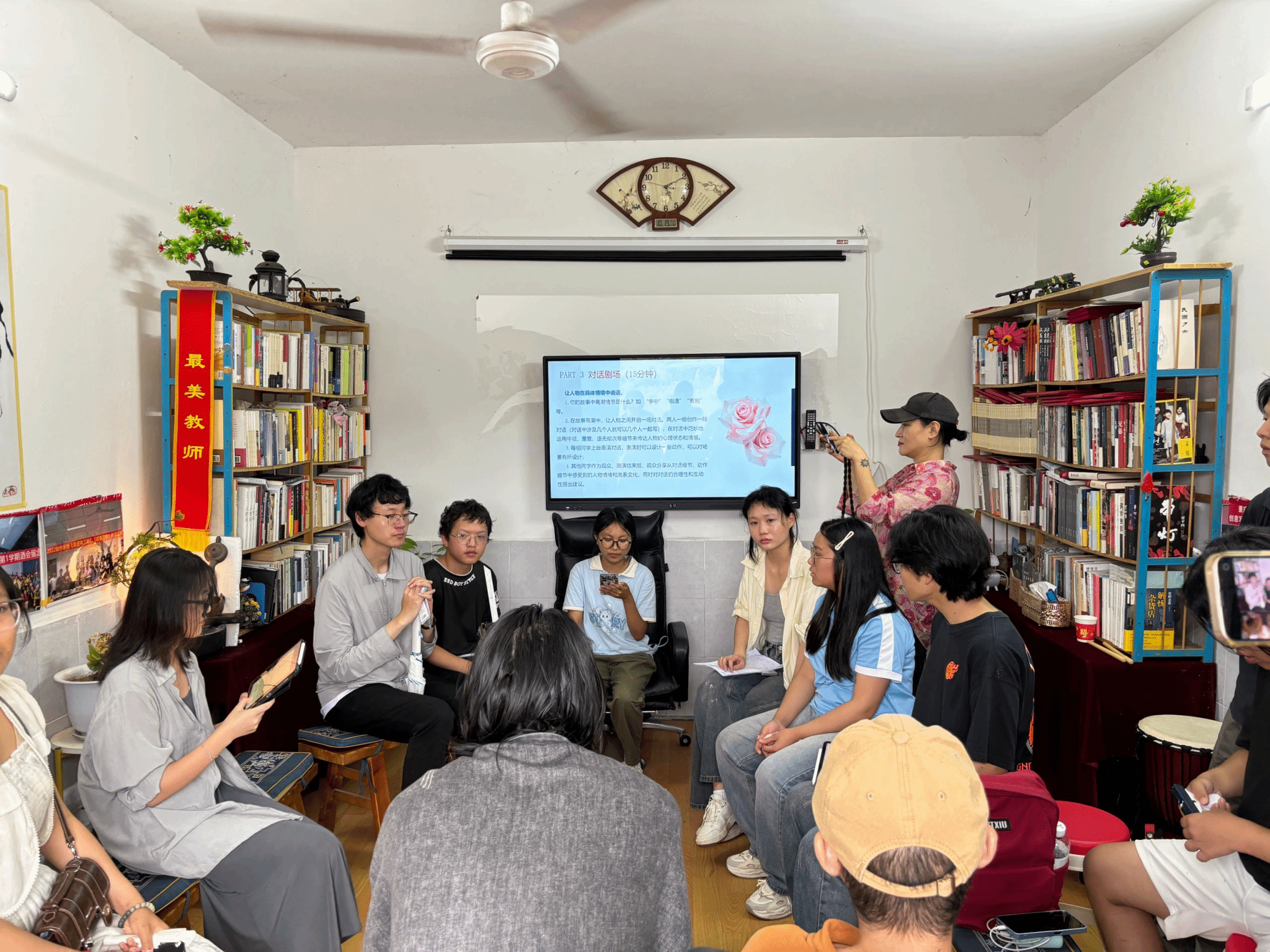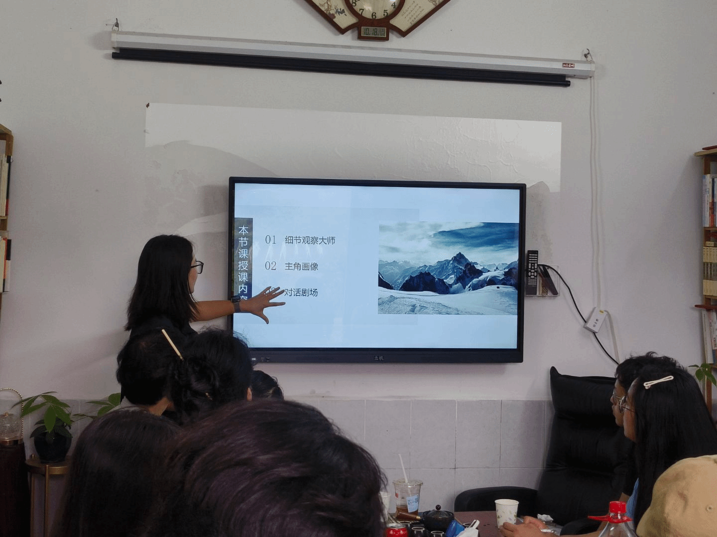 课程中段,马老师给同学们放了两部影视片段。在《祥子》片段中,同学们围绕拉车夫的生存状态各抒己见,刘玉婷认为“祥子的软弱源于时代压迫”,杨莹同学则指出“骨气在强权面前的溃败更显悲剧张力”;而《玫瑰的故事》里,黄亦玫滑轮滑的片段让同学们捕捉到角色灵魂——飞扬的发丝、娴熟的动作与灿烂的笑容,共同呈现出自由、自信的人物形象。最后马老师讲道:“大家观察得非常仔细,我们在写作中也同样可以利用细节设计来构建故事世界。”