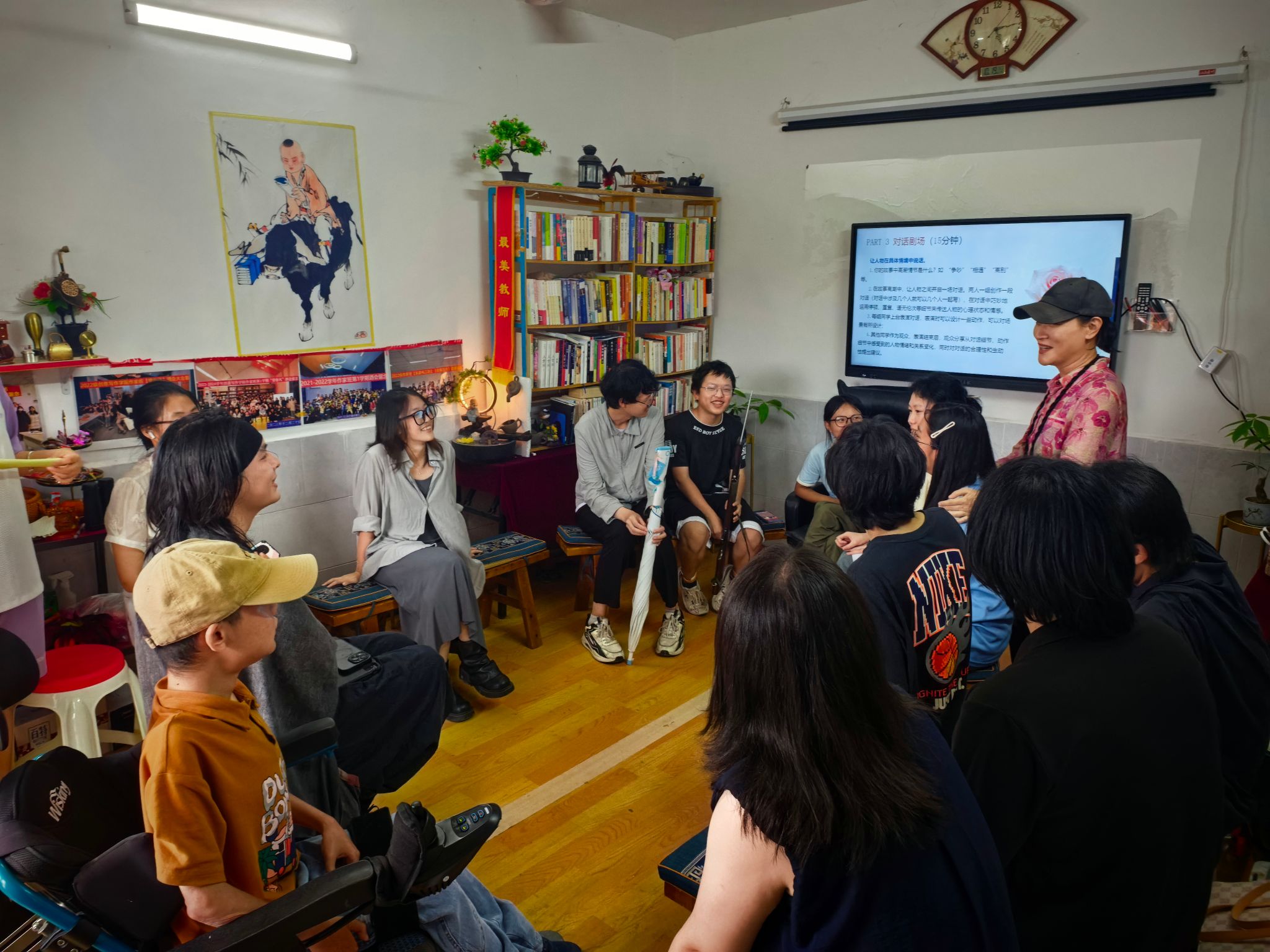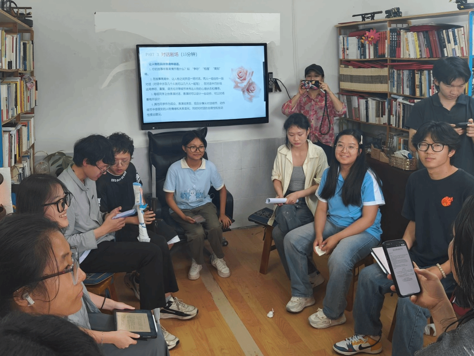 在四个小组同学声情并茂的剧场演绎后,紧接着开启了学生作品原创小说研讨环节。本次课程研讨陈泠同学的原创作品《转身,流浪》,由苏瓷瓷老师带领各小组同学展开讨论。在一番激烈的讨论过后,小组学生代表对该作品发表了各自的看法。其中,杨宇辉同学认为文章前部分写“狗”的篇幅过长,导致与后面“收养”的情节不能完美衔接,且在结尾中关于“狗决定继续流浪”这一动机阐释不明。而牟柏霖同学提到,无论是老人还是狗——来福都是渴望去流浪的,文中老人躲在厕所抽烟,不想被孙女发现,其实蕴藏了对自由的渴望。