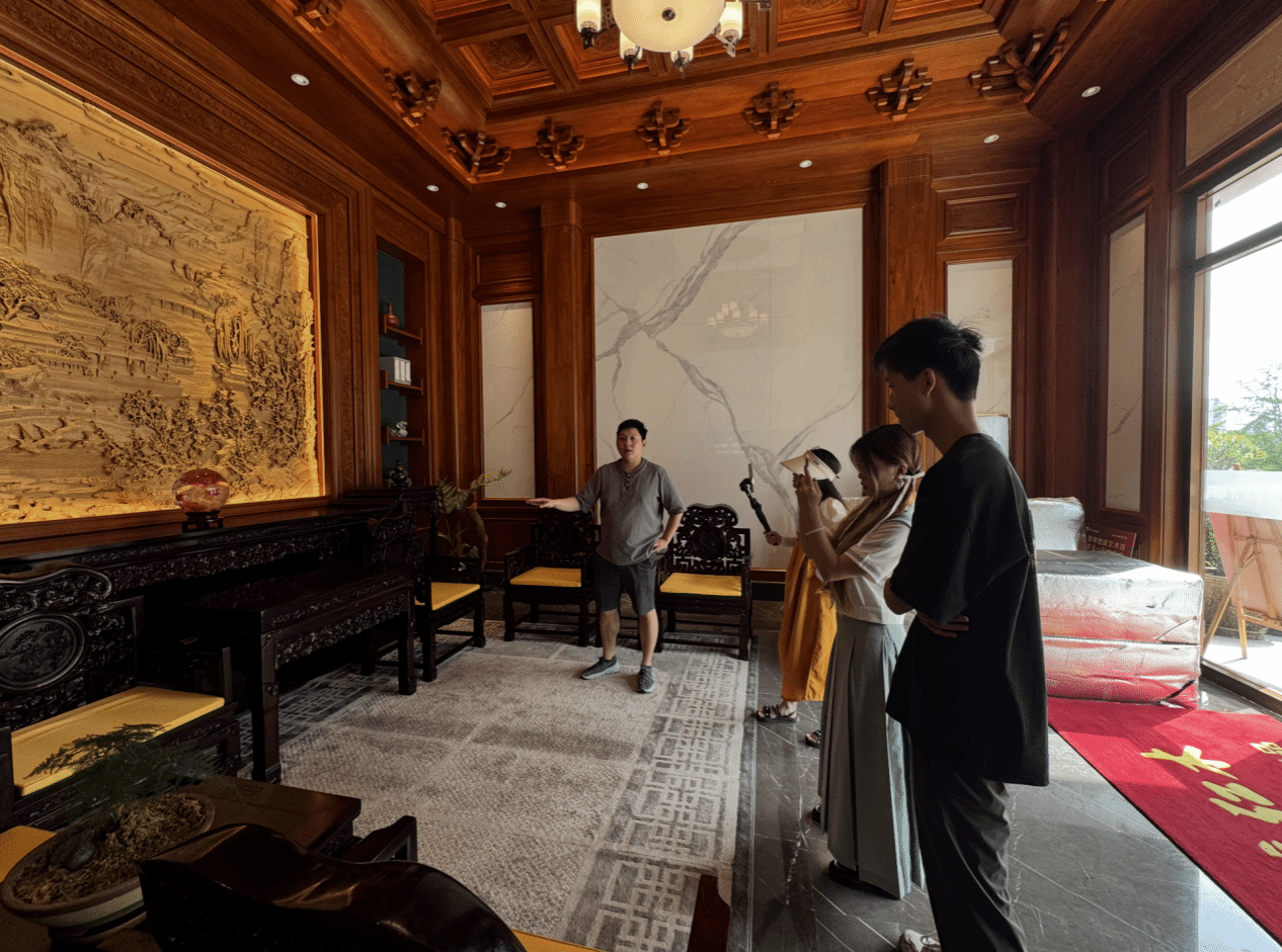 次日,师生一行人探访了位于西部建材城的李忠信红木。重庆地区负责人贺博华是一位对传统文化有着深厚热爱的创业者,他分享了自己进入红木行业的缘由。贺博华表示,早年在北方经商的经历,当地对文化的重视对他产生了深远影响。采访中,有同学向贺博华提问:“您身为90后,要怎样把红木这种蕴含传统文化底蕴的行业,推广给更多年轻群体呢?”面对这一提问,贺博华表示,打算利用好社交媒体平台,像抖音、小红书这些年轻人聚集的地方,制作有趣又有料的短视频,通过一些潮流木作小物件,让更多的年轻人爱上红木文化。贺博华认为,红木文化的传承,必须有人挺身而出、勇担责任,而这也正是他毅然选择并始终坚守这一行业的关键因素。