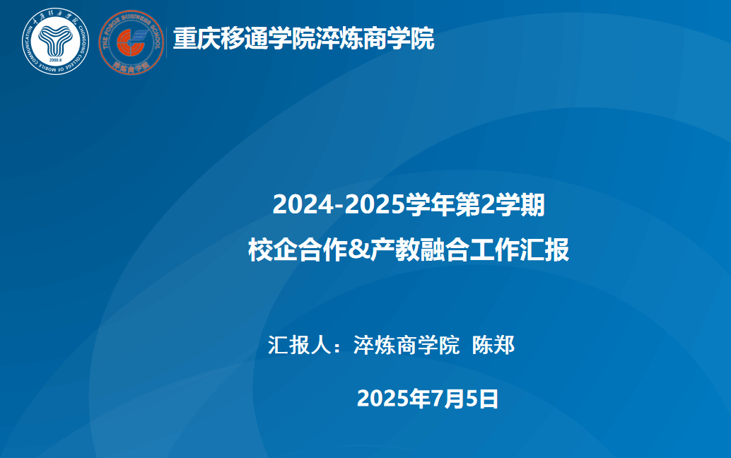 重庆移通学院淬炼商学院陈郑老师汇报了本学期校企合作与产教融合情况。一是校企合作,本学期与浙江横店影视城、凯优营销、重庆牧歌等企业达成合作,目标是服务于中小企业。二是访企拓岗,本学期完成了9家访企拓岗,增加了学生的实习和就业机会。三是认识实习,组织2024级大一新生(涵盖工商管理、财务管理、市场营销、资产评估4个专业共800多名学生)前往京东、江小白、陈昌银麻花等公司进行认识实习。四是实战项目,立项的七个实战项目,开展了营销策划、销售实训、企业走访等活动,预计今年10月底结项。五是挂职锻炼,寒暑假有老师去企业挂职锻炼,今年暑假有10位老师参与企业挂职锻炼,主要参加企业的财务管理、人力资源管理等工作。