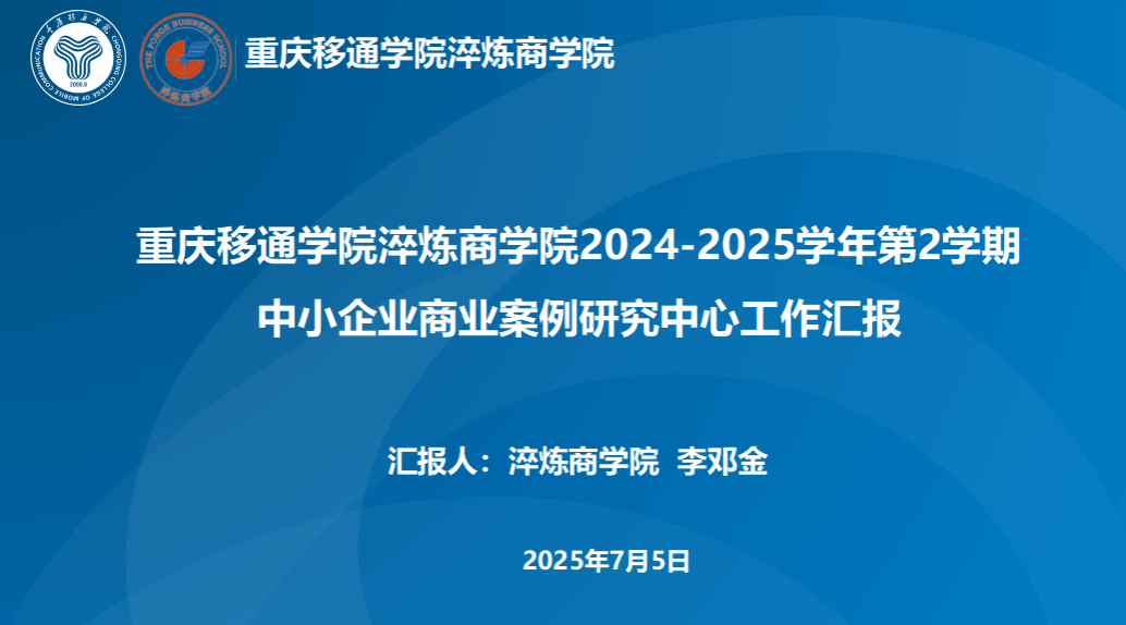 重庆移通学院淬炼商学院基础教研室主任李邓金汇报了中小企业商业案例研究中心本学期的工作开展情况。中小企业商业案例研究中心案例管理系统建设工作已完成了前期调研、方案起草及论证工作、现已经进入招投标阶段。师生案例研讨活动共开展5期,案例工坊活动2场,活动分别邀请了清华大学经济管理学院中国工商管理案例中心赵子倩主任、桂林理工大学商学院案例中心主任周晓睿博士进行分享。案例征集共收到三校四区商科教师撰写的商业故事案例42篇,即将进行最后整理及组织评审工作。
