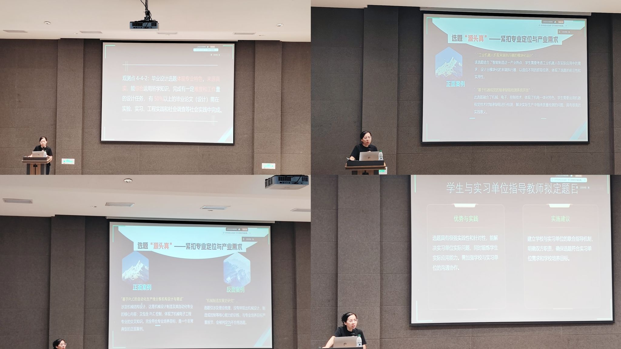 接下来,强华教授以“毕业设计选题”为核心,围绕“源头真、过程实、落点新、表述准”四大要点展开指导。毕业设计的题目应该紧扣专业定位,把好选题“源头关”;强化实践梯度,夯实能力培养“过程关”;聚焦技术创新,突出成果“新落点”。