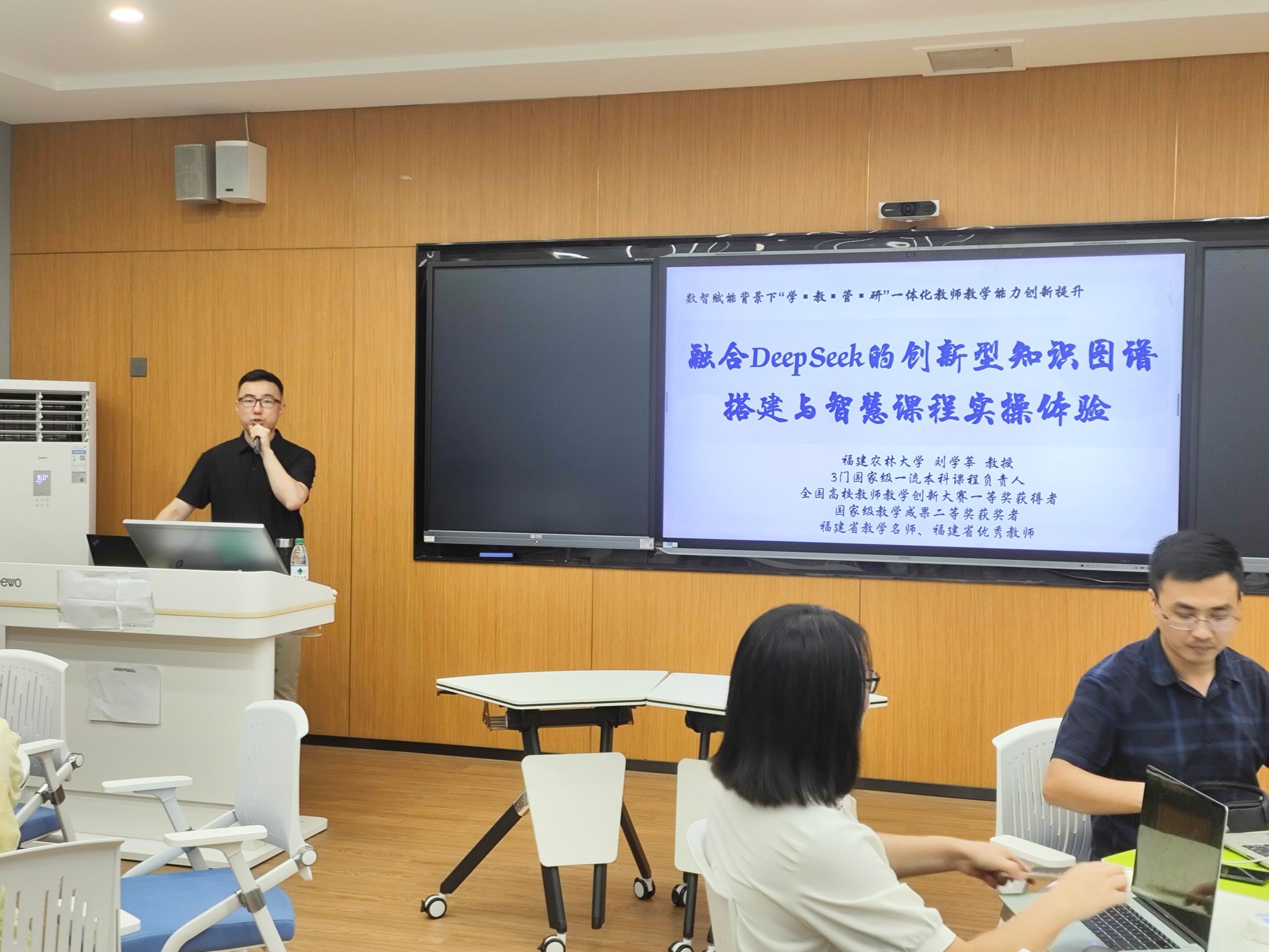 活动伊始,福建农林大学的刘学莘教授作为主讲嘉宾,为大家带来了“融合DeepSeek的创新型知识图谱搭建与智慧课程实操体验”的精彩分享。刘学莘教授不仅是3门国家级一流本科课程的负责人,还荣获全国高校教师教学创新大赛一等奖,其丰富的教学经验与深厚的学术造诣令人钦佩。在活动中,刘教授深入浅出地介绍了数智时代教育面临的机遇与挑战。他指出,随着人工智能、大数据等技术的飞速发展,传统的教学模式正逐渐被打破,智慧课程已成为提升教学质量、培养学生创新能力的关键路径。围绕DeepSeek这一先进工具,刘教授详细阐述了如何搭建创新型知识图谱。他通过实际案例展示,让老师们直观地感受到知识图谱在整合教学资源、梳理知识体系以及引导学生自主学习等方面的强大作用。