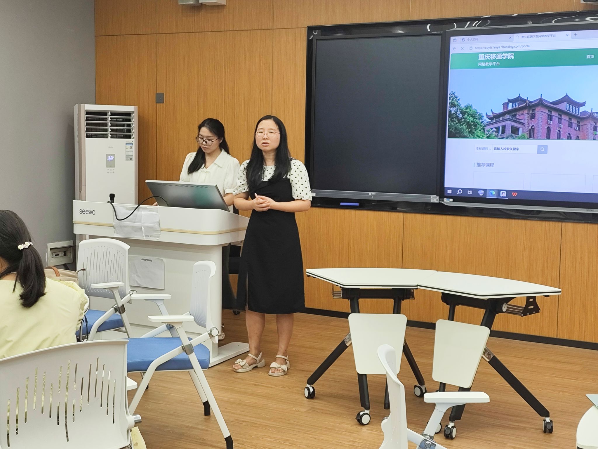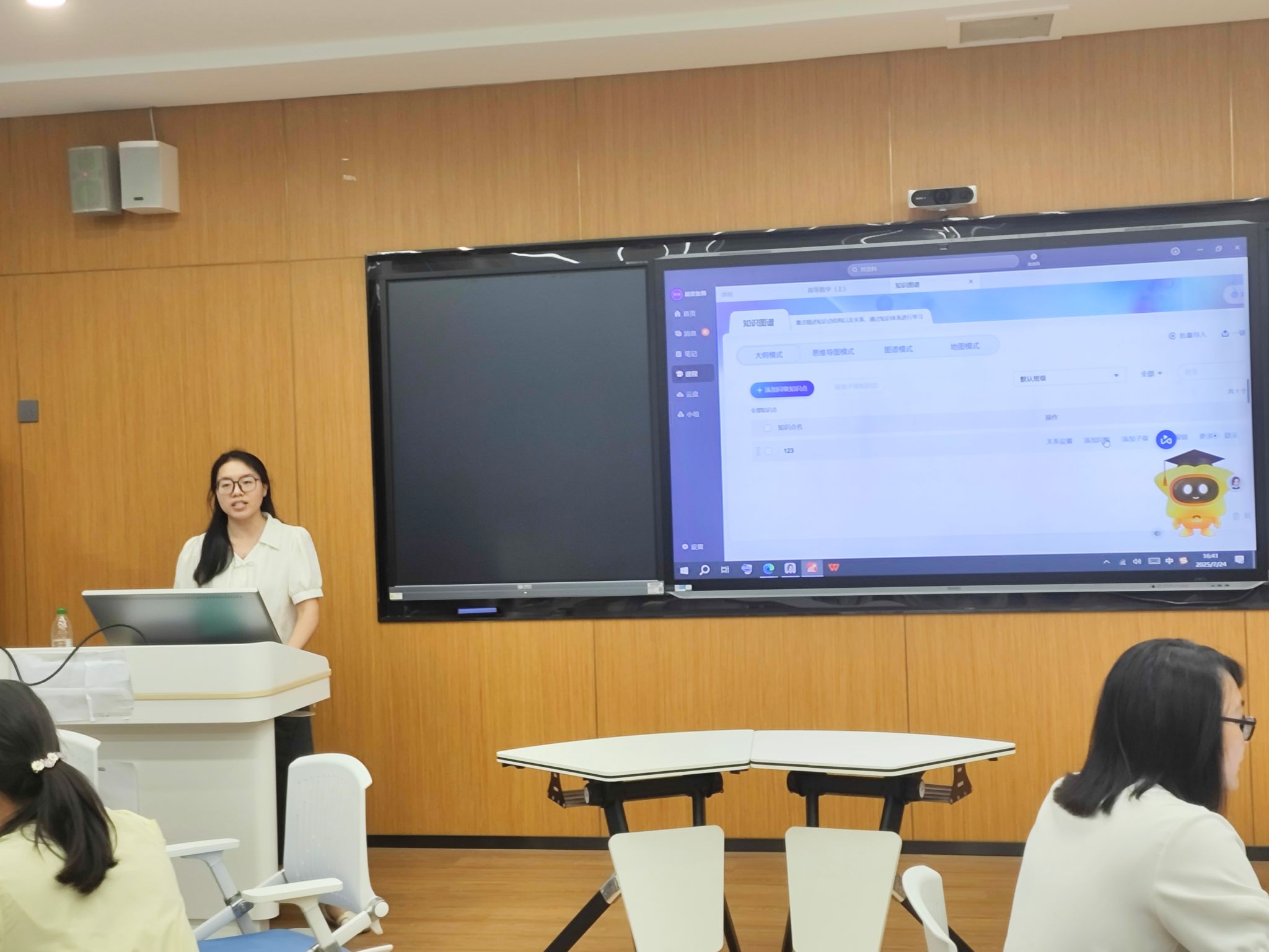 随后,超星工作人员陈月围绕智慧课程中的智能体课程建设,讲解了如何利用超星与学校共同搭建的一体化教学平台开展知识图谱构建、题库建设、AI助教生成等智能教学模块的应用。她通过平台实时演示,向教师们详细展示了从课程知识框架梳理、知识点关联标注,到利用AI工具自动生成结构化知识图谱的全过程。讲解过程中,教师们纷纷打开自带设备跟随操作,针对平台的操作细节、数据对接规范以及如何适配不同专业课程特色等问题进行了深入咨询,现场互动频繁,研讨氛围热烈。