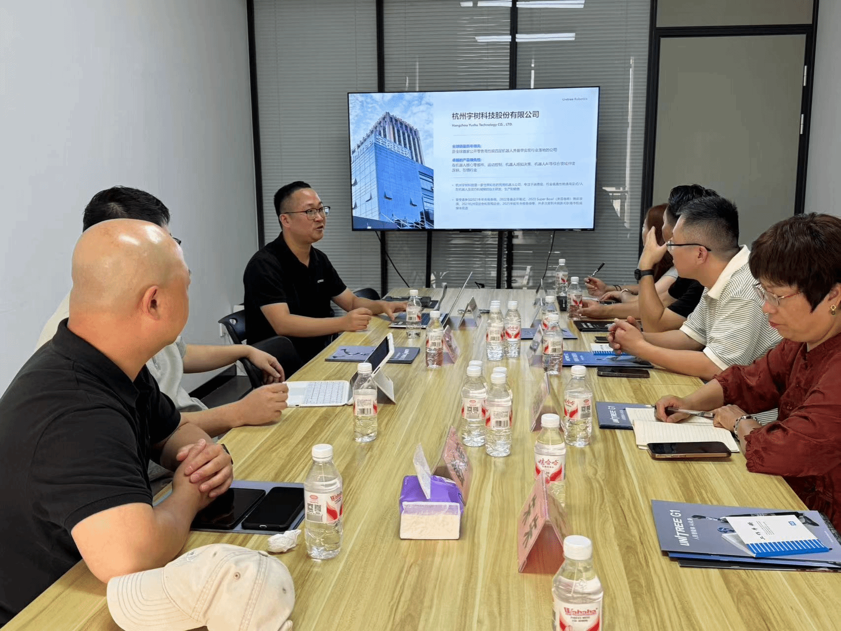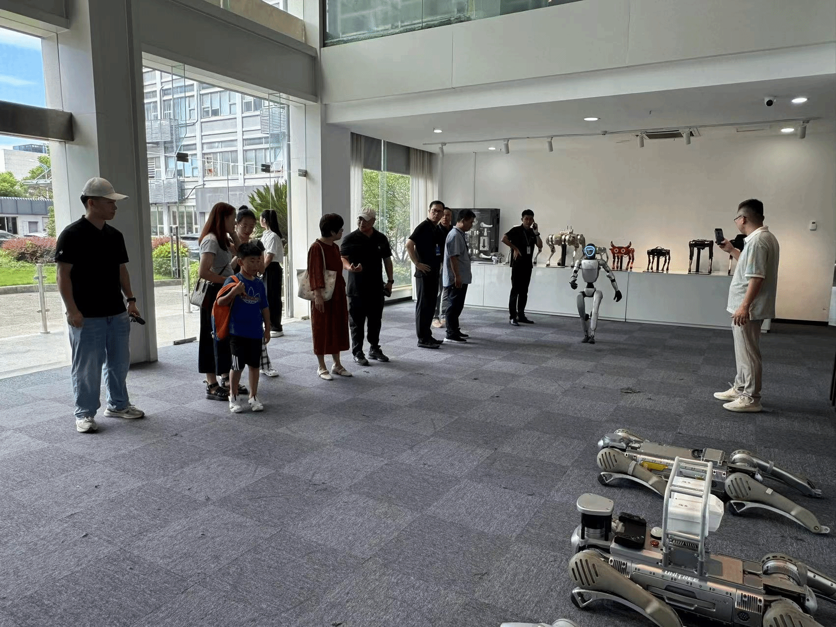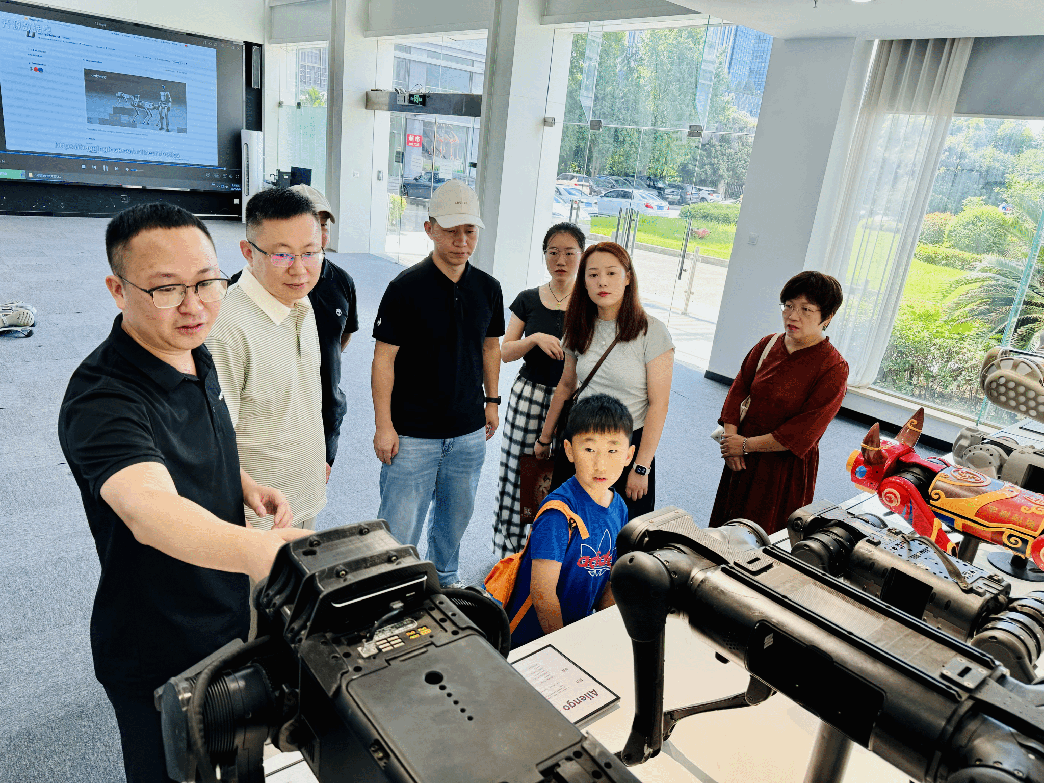 为推进 “智能交互机器人综合应用实验室” 高水平建设,深化产教融合,8 月 6 日,重庆移通学院副校长张衍学率计算机学院、资产处专项调研组,赴杭州宇树科技股份有限公司(以下简称 “宇树科技”)开展实地调研。计算机学院院长向碧群,资产处处长李克伟、傅鑫宇科长、朱朱老师,以及计科教研室主任卢星儒参与调研,重点考察宇树科技机器狗、G1 人形机器人等核心产品的技术性能、成本效益及教学适配性。宇树科技联合创始人及董事陈立、教育生态合作负责人吴秉昊、产品总监詹建忠、西南区域销售总监彭涛热情接待并深入交流。