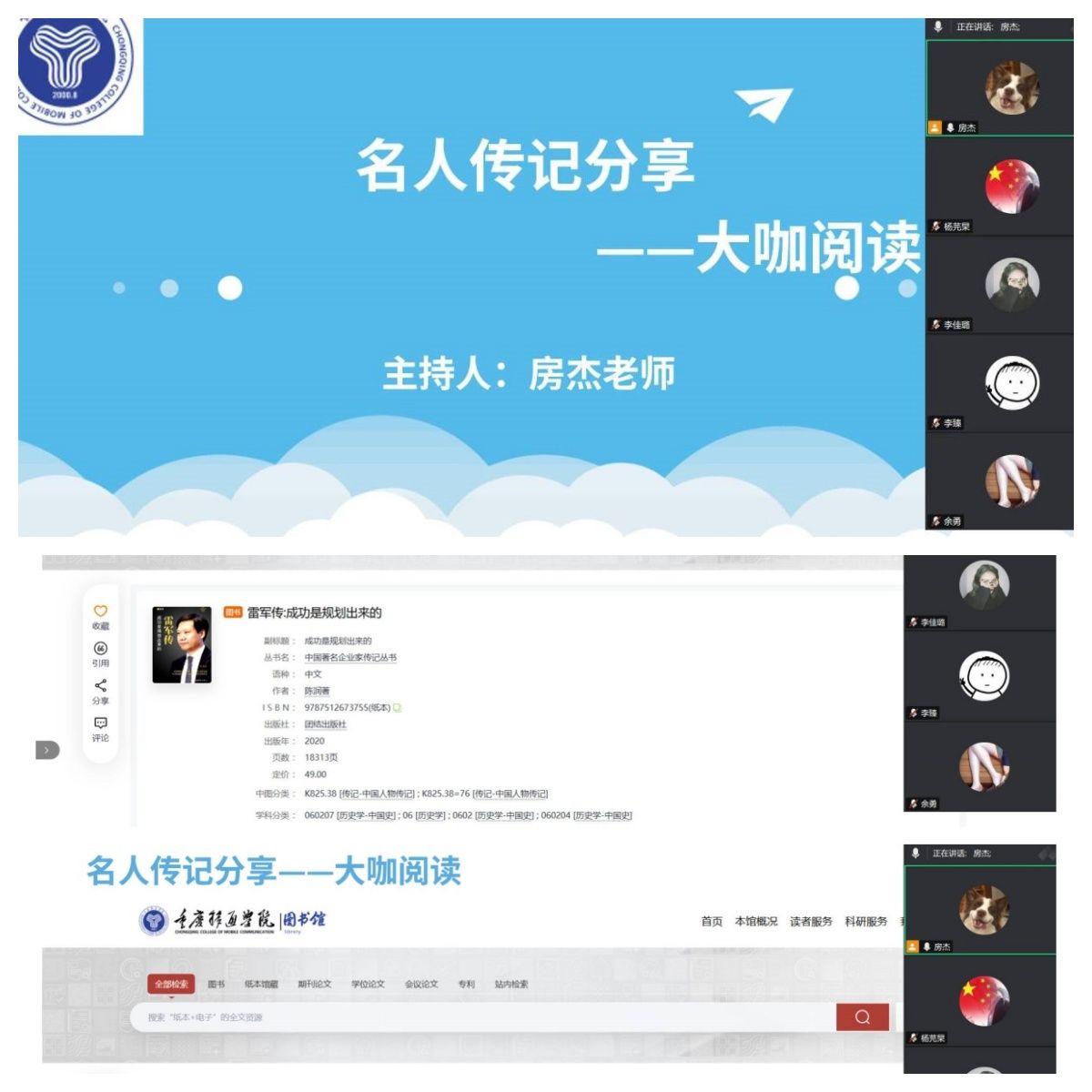 8月23日,学业导师房杰老师与电子信息工程专升本1班开展了线上大咖阅读分享会,本次会议师生共同学习了《雷军传》与《钢铁硅谷侠》,同时引领了电子信息工程专升本1班的同学们共同领略名人传记的魅力,从中获取了诸多商业智慧。